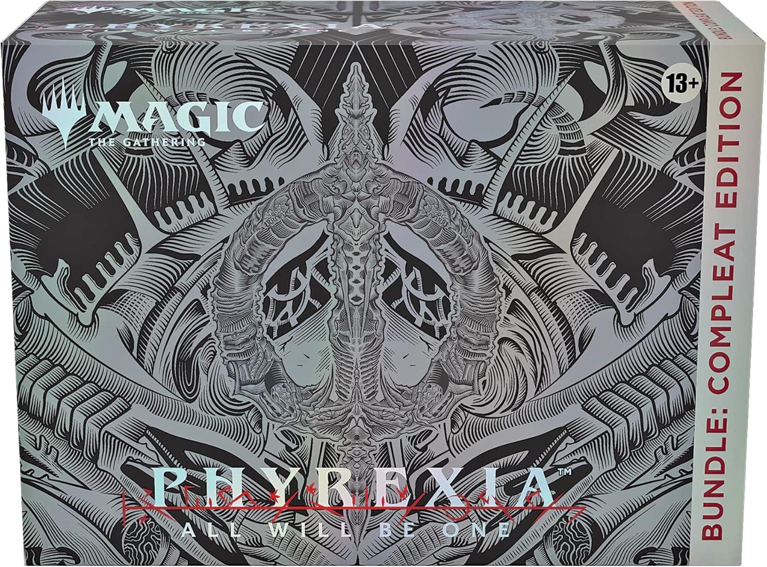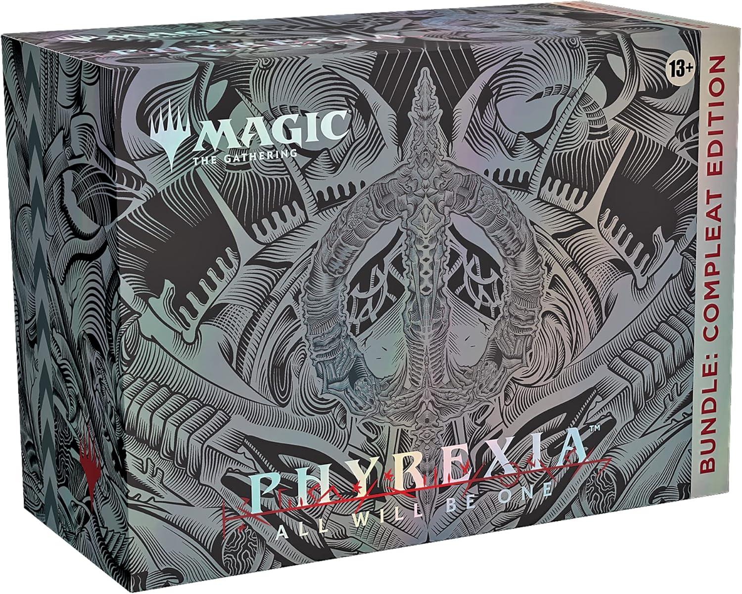 Prove your devotion to perfection with the Phyrexia: All Will Be One Bundle: Compleat Edition. With a legion of Phyrexian goodies you won’t find anywhere else, it’s the ultimate gift for any Magic fan—including you. This special bundle contains a 12-card Compleat Edition booster containing 2 cards from a pool of 20 Mythic Rares from the Phyrexia: All Will Be One main set printed with an Oil Slick Raised Foil treatment exclusive to the Compleat Edition, plus 10 Oil Slick Raised Foil Basic Land cards (2 of each type). It also contains 12 Phyrexia: All Will Be One Set Boosters, 1 Traditional Foil Rare promo card, 40 Traditional Foil land cards that celebrate the glory of Phyrexia, and 1 Compleat Edition-exclusive foil card storage box. Each Set Booster contains 12 Magic cards, 1 Art Card, and 1 token/ad card or card from “The List” (a special card from Magic's history or Universes Within card), with a combination of 1–4 card(s) of rarity Rare or higher and 3–7 Uncommon, 3–7 Common, and 1 Land cards. Every booster contains at least 1 Traditional Foil card.