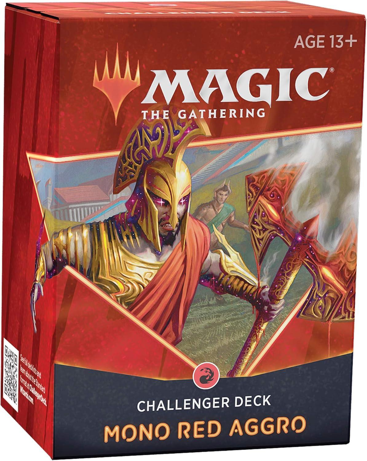 This 60-card deck is tournament-ready and playable right out of the box. Crush your opponents, fine-tune your strategy with a 15-card sideboard, and store it all in the included deck box (holds 75 sleeved cards.) With fan-favorite cards from Zendikar Rising, Theros Beyond Death, Throne of Eldraine, and Core Set 2021, the Mono Red Aggro Challenger Deck is forged from some of the most powerful strategies in Standard. Play with cards featuring the landfall and kicker mechanics, and get 3 Mythic Rares (including 2 Modal Double-Faced Cards), 21 Rares, 19 Uncommons (including 4 MDFCs), 16 Commons, and 16 Basic Land Cards. CONTENTS: 60-card deck, 15-card sideboard, 6 double-faced card (DFC) helper cards, 5 double-sided tokens, 1 deck box