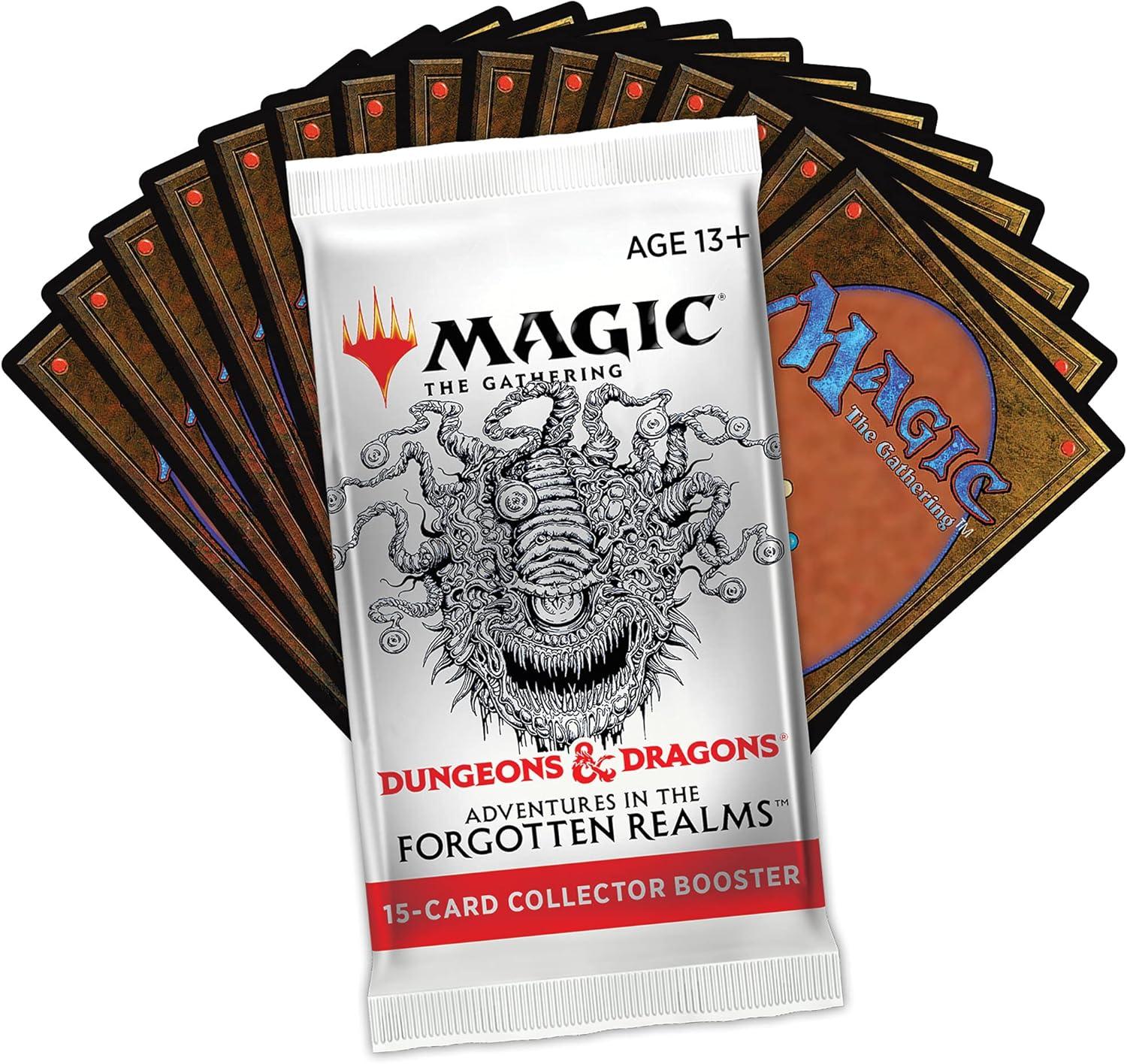 Every Adventures in the Forgotten Realms Collector Booster contains 15 Magic: The Gathering cards and 1 traditional foil double-sided token, with a combination of 5 Rares and/or Mythic Rares, 2–5 Uncommons, 4–7 Commons, and 1 Land card. In each pack, you’ll find a total of 4–5 Showcase or Borderless cards, 2–3 Extended-Art cards, and 10 traditional foil cards. Foil Mythic Borderless Planeswalker in 4% of boosters.