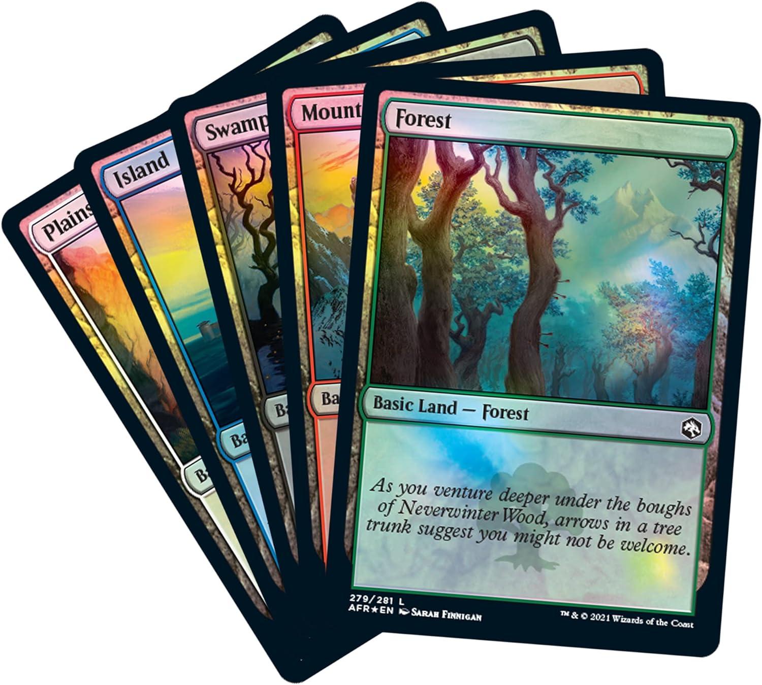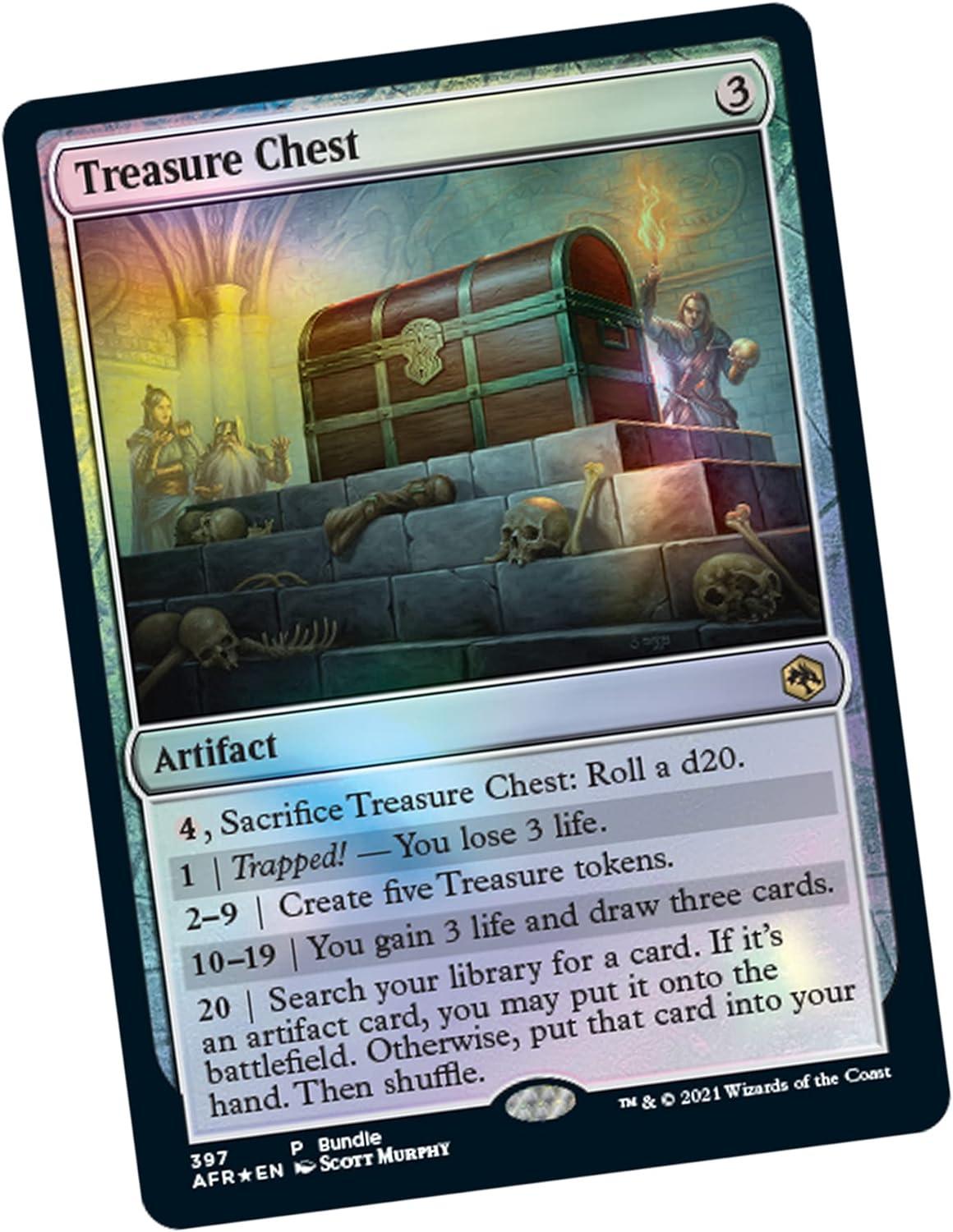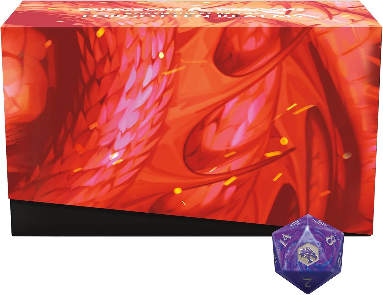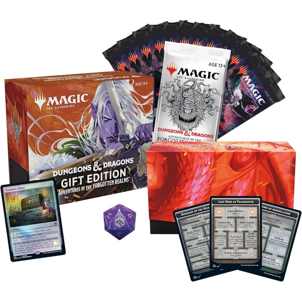 The Adventures in the Forgotten Realms Gift Bundle contains 10 Adventures in the Forgotten Realms Draft Boosters—the best boosters for drafting, plus 1 Adventures in the Forgotten Realms Collector Booster full of foils (total of 10 traditional foil cards), special card treatments (4–5 Showcase or Borderless cards, 2–3 Extended-Art cards), and 5 Rare and/or Mythic Rare cards. It also includes 3 oversized dungeon cards (Tomb of Annihilation, Dungeon of the Mad Mage, and Lost Mine of Phandelver), 40 basic lands (20 traditional foils and 20 nonfoils), 1 traditional foil alt-art promo card—Treasure Chest, 1 oversized Gift Edition d20, 1 special foil card storage box, and 2 reference cards.