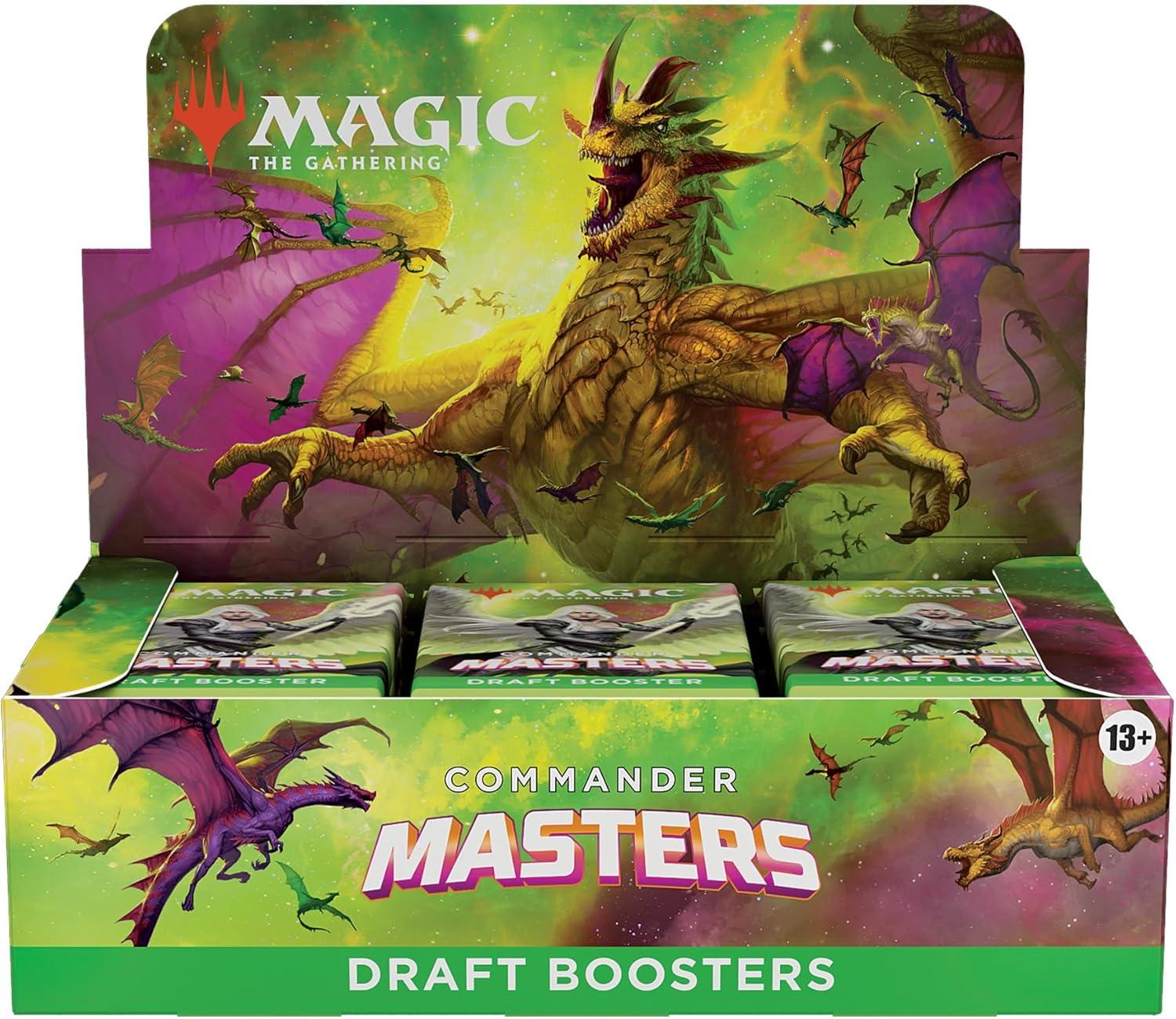 Play the greatest hits from Magic’s biggest format! This curated Masters selection is stacked with the finest reprints for unmatched multiplayer drafting. We’ve also got some surprises in store, with some packs containing special card treatments that will spice up your draft and wow the table. The Commander Masters Draft Booster Box contains 24 Commander Masters Draft Boosters. Each Draft Booster contains 20 cards and 1 double-sided token, including 2–4 cards of rarity Rare or higher (3: 36%; 4: 3%), 5–7 Uncommon, and 11–12 Common cards. Traditional Foil Borderless Mythic in <1% of boosters.