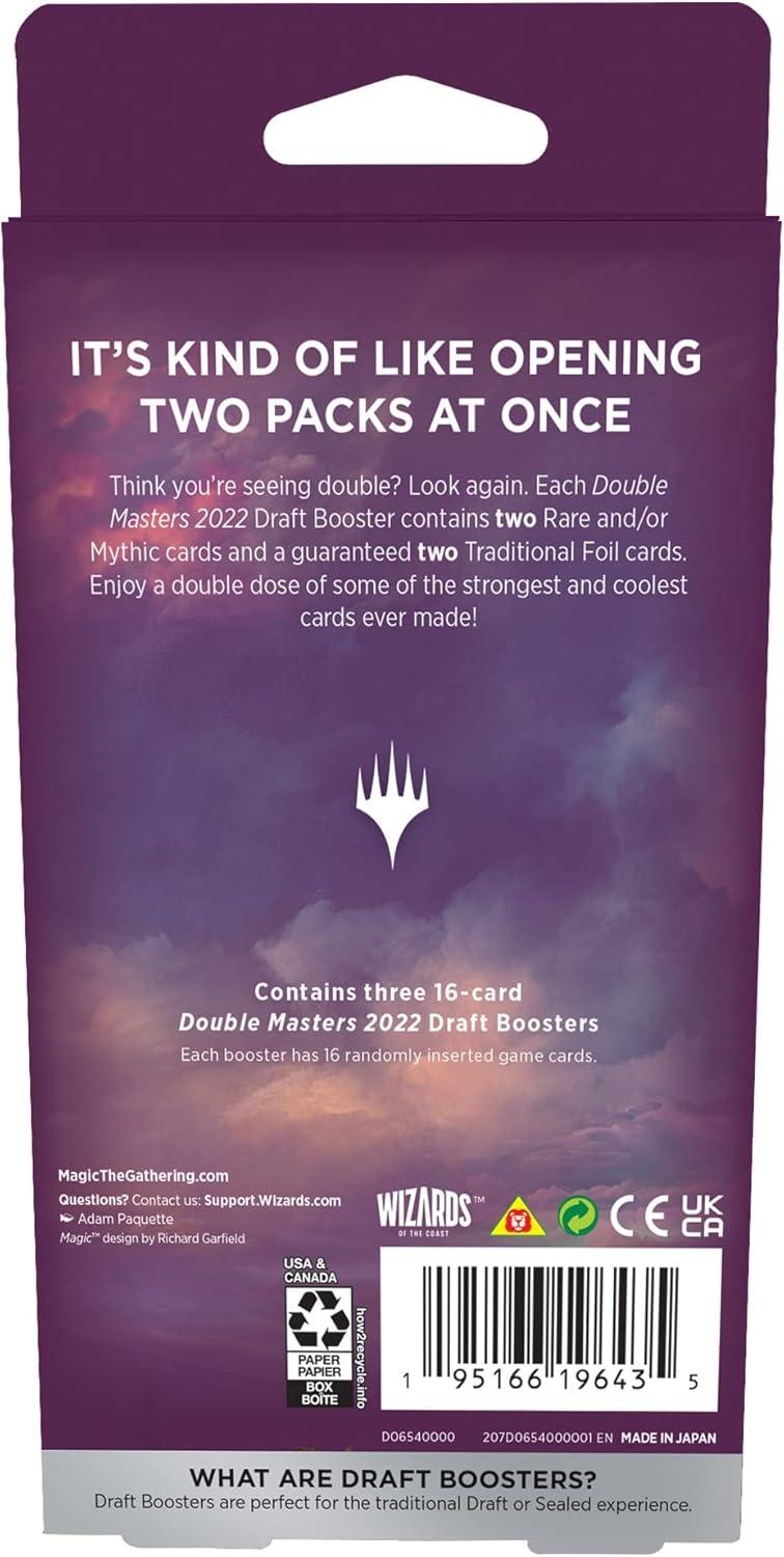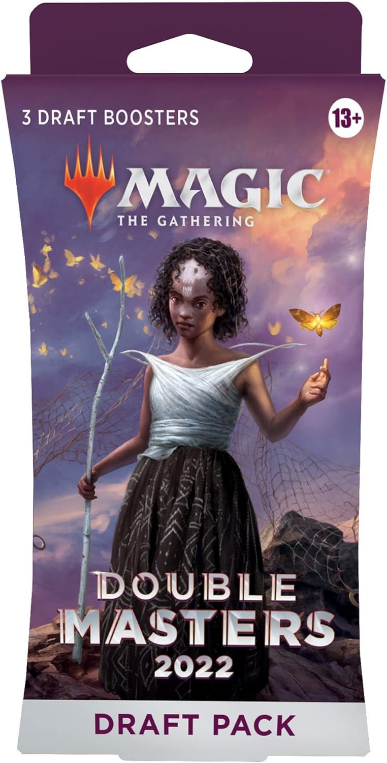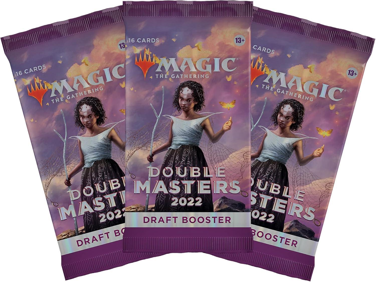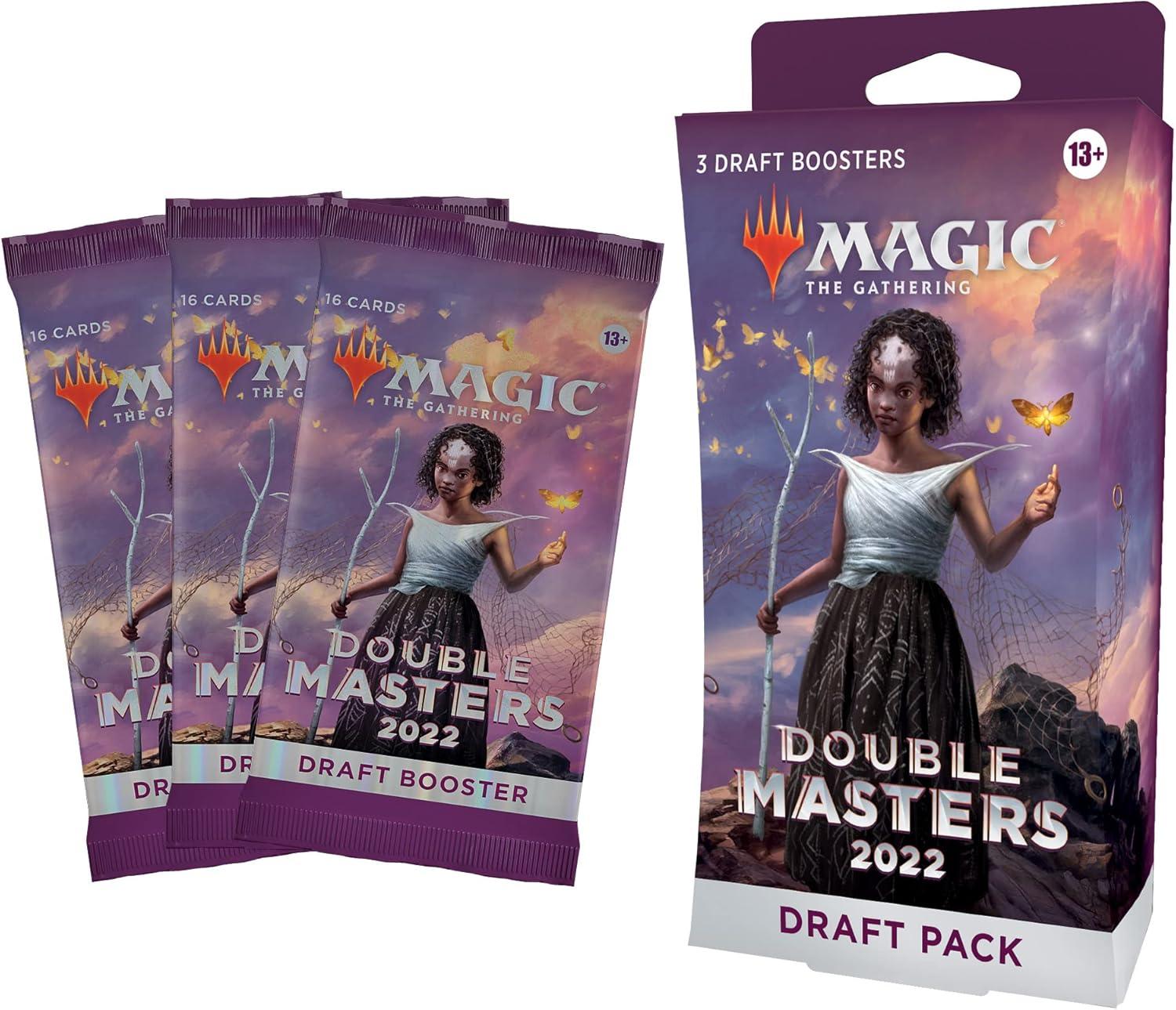 The Double Masters 2022 Draft Pack contains 3 Double Masters 2022 Draft Boosters. Each Draft Booster contains 16 Magic cards and 1 token/ad card, with a combination of 2–4 cards of rarity Rare or higher and 3–5 Uncommon, 8–10 Common, and 1 Land cards. Two cards of any rarity are Traditional Foil. Traditional Foil Borderless Mythic Rare Planeswalker in <1% of boosters.