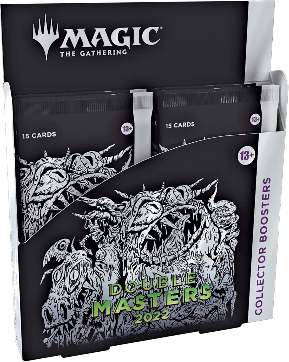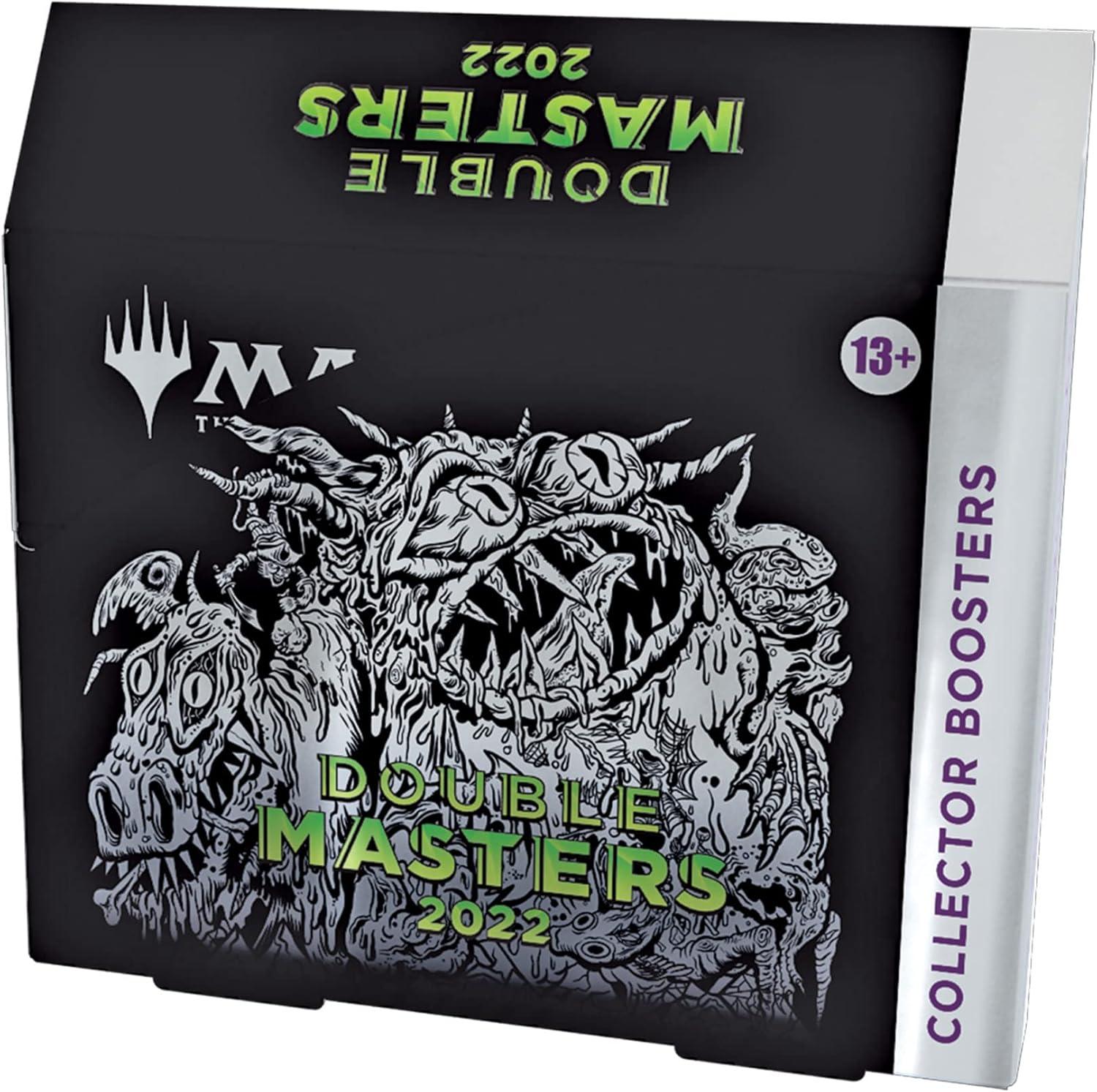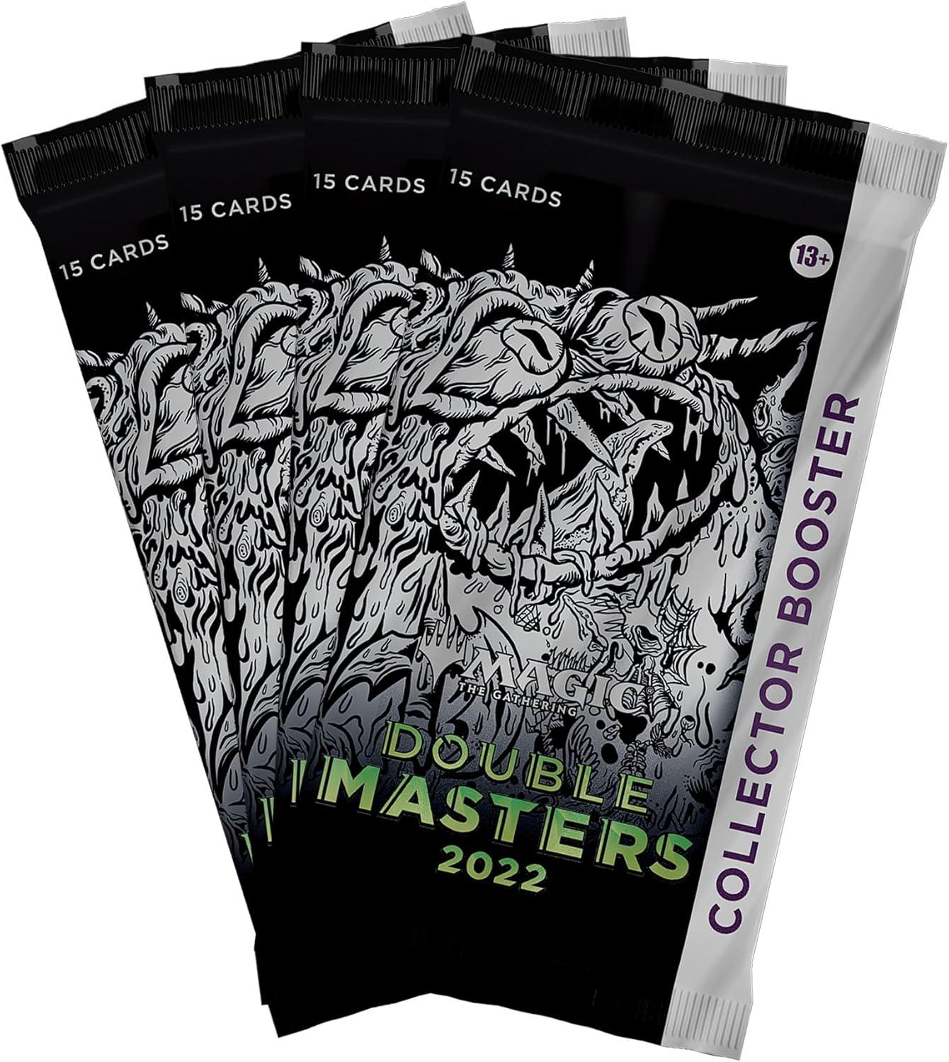 The Double Masters 2022 Collector Booster Box contains 4 Double Masters 2022 Collector Boosters. Each Collector Booster contains 15 cards and 1 Traditional Foil double-sided token, with a combination of 4 cards of rarity Rare or higher, 2–6 Uncommon, and 5–9 Common cards. Every pack contains 10–11 Traditional Foil cards and 1 Rare or Mythic Rare Foil-Etched card. Textured Foil Mythic Rare in 3% of boosters.