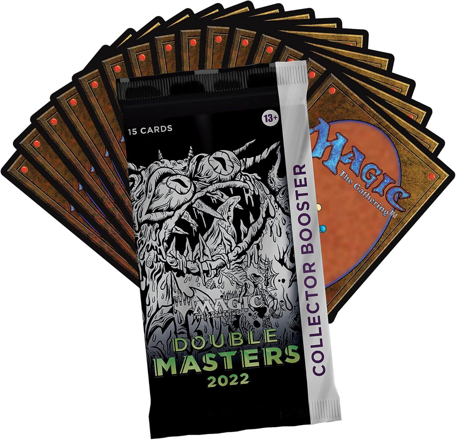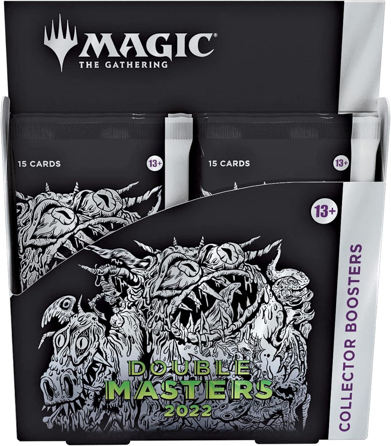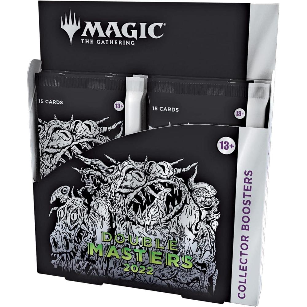 The Double Masters 2022 Collector Booster Box contains 4 Double Masters 2022 Collector Boosters. Each Collector Booster contains 15 cards and 1 Traditional Foil double-sided token, with a combination of 4 cards of rarity Rare or higher, 2–6 Uncommon, and 5–9 Common cards. Every pack contains 10–11 Traditional Foil cards and 1 Rare or Mythic Rare Foil-Etched card. Textured Foil Mythic Rare in 3% of boosters.
