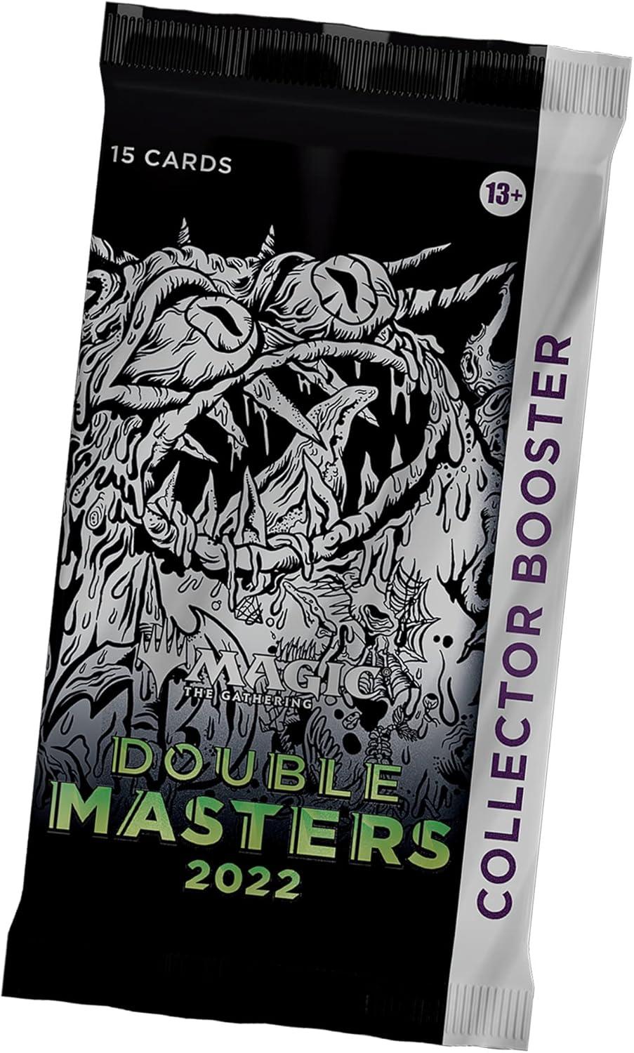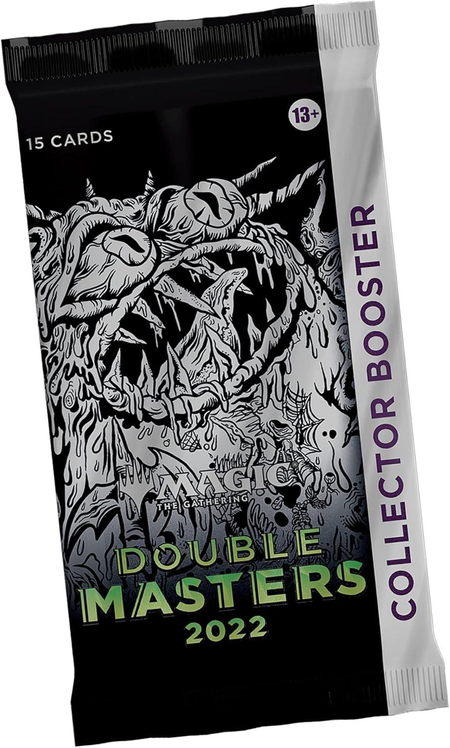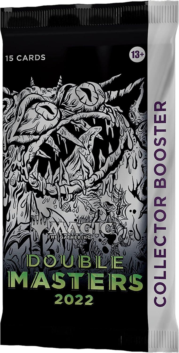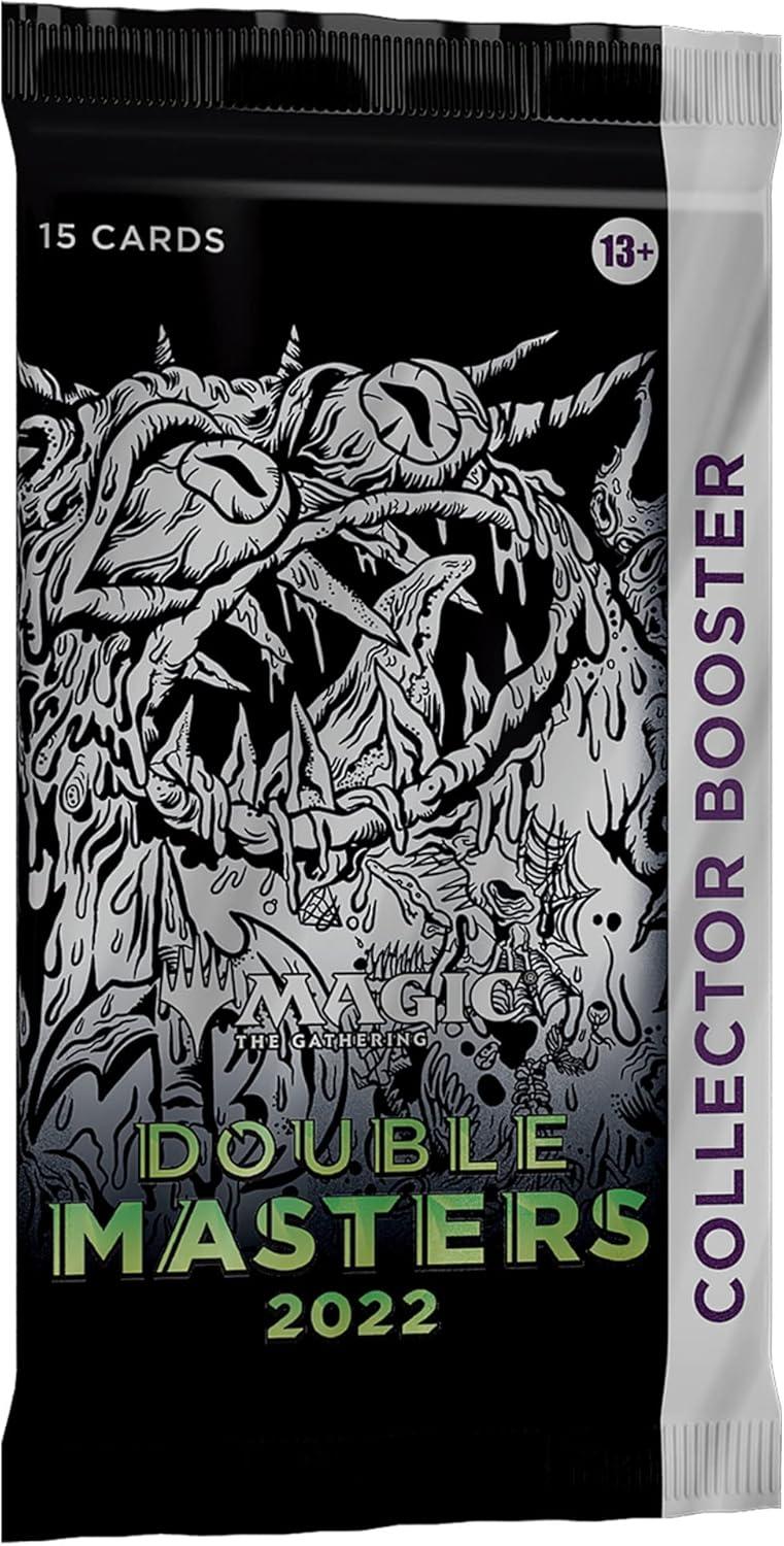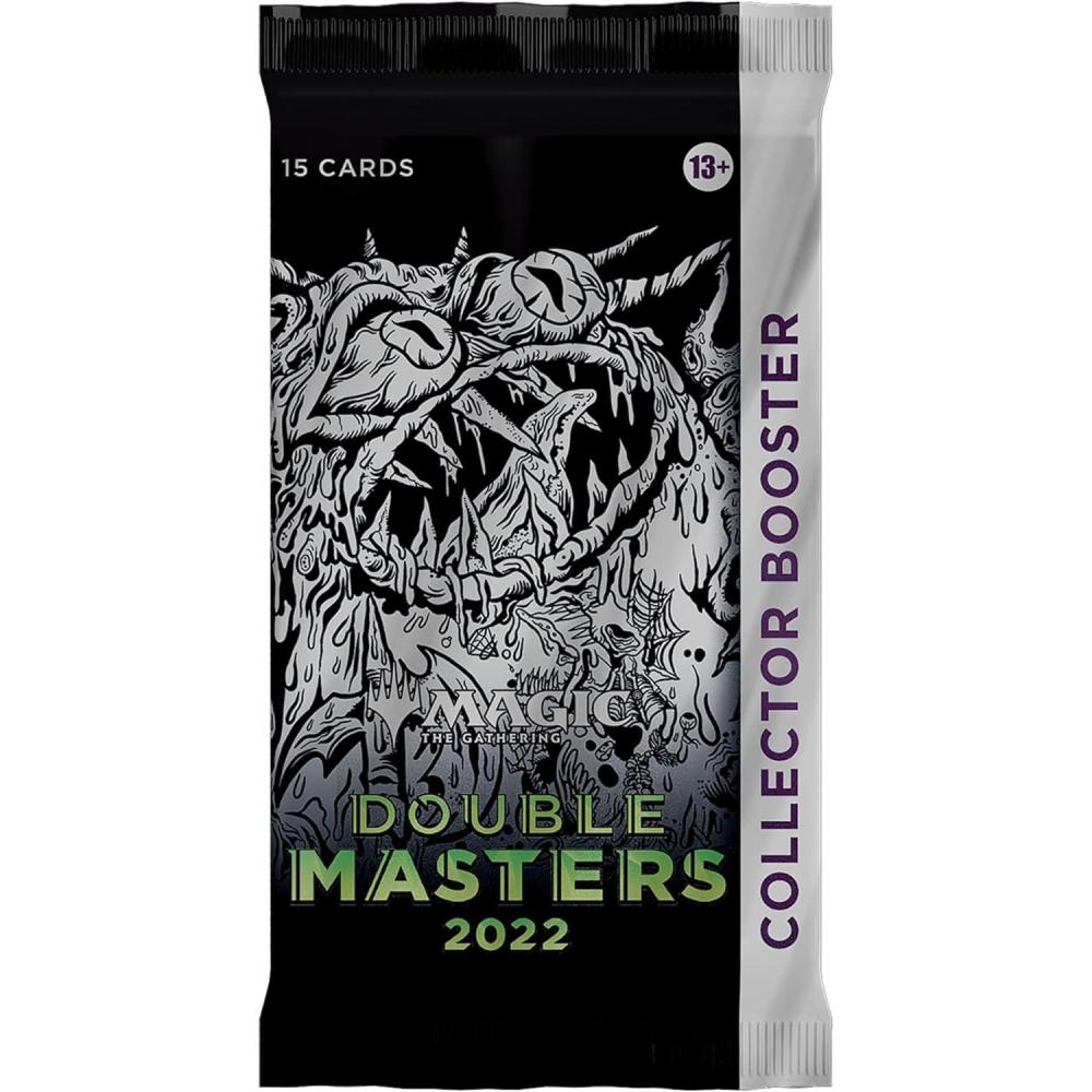 The Double Masters 2022 Collector Booster Box contains 4 Double Masters 2022 Collector Boosters. Each Collector Booster contains 15 cards and 1 Traditional Foil double-sided token, with a combination of 4 cards of rarity Rare or higher, 2–6 Uncommon, and 5–9 Common cards. Every pack contains 10–11 Traditional Foil cards and 1 Rare or Mythic Rare Foil-Etched card. Textured Foil Mythic Rare in 3% of boosters.