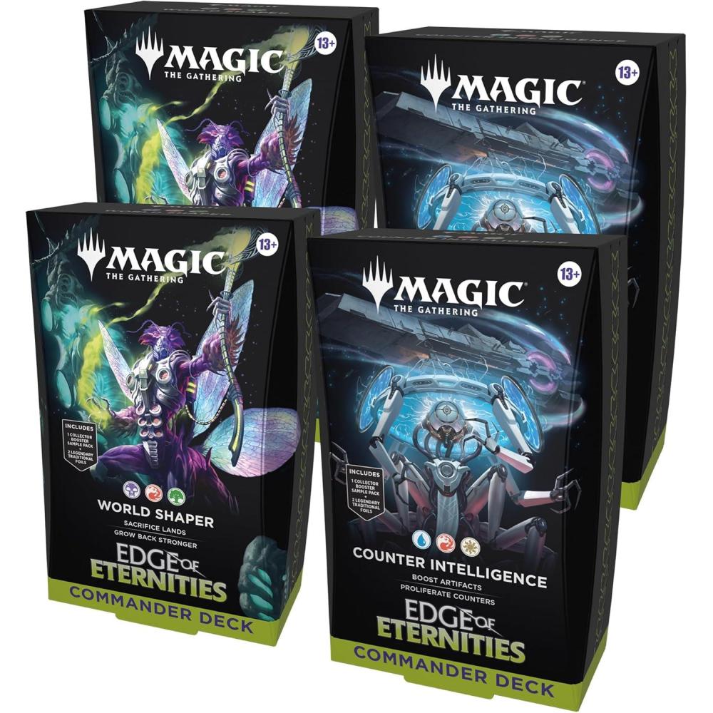 This bundle includes 2 of each Edge of Eternities Commander Deck, with 2 World Shaper decks and 2 Counter Intelligence decks. Each includes 1 deck of 100 Magic cards (98 nonfoil cards and 2 Traditional Foil Borderless Legendary cards), a 2-card Collector Booster Sample Pack (contains 1 Traditional Foil or nonfoil alt-border card of rarity Rare or higher and 1 Traditional Foil Uncommon card), double-sided token cards (10 in Counter Intelligence and 6 in World Shaper), 1 deck box (can hold 100 sleeved cards), 1 strategy insert, and 1 reference card.