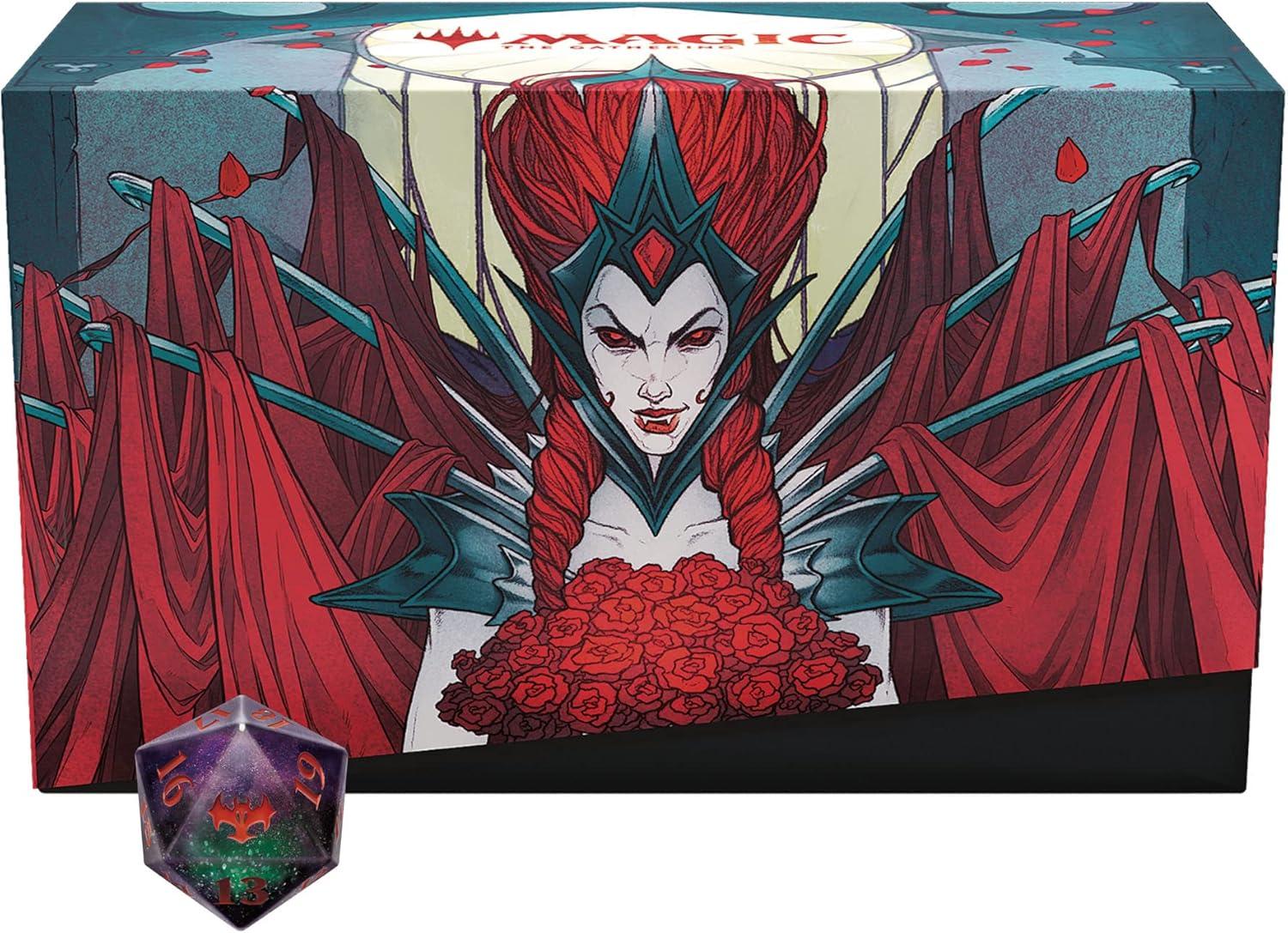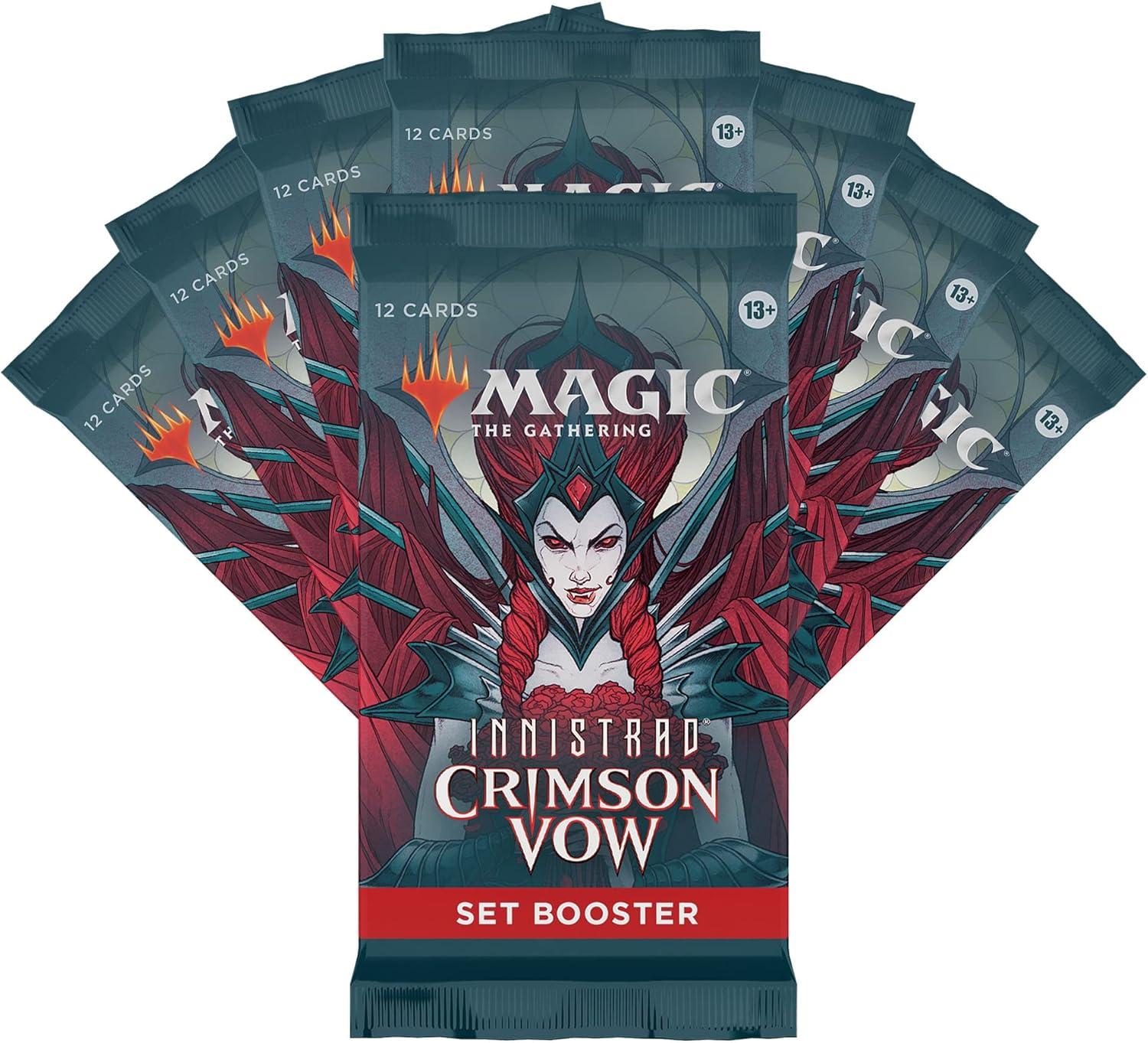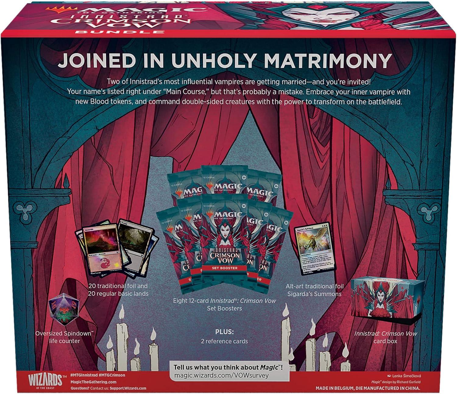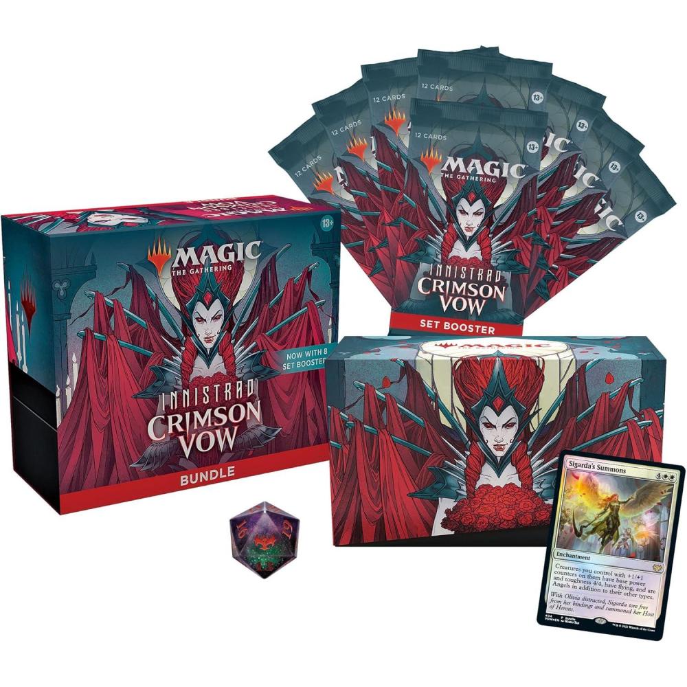 The Innistrad: Crimson Vow Bundle contains 8 Innistrad: Crimson Vow Set Boosters—the best boosters to open just for fun—plus accessories, with 40 basic lands (20 traditional foils and 20 nonfoils), 1 traditional foil promo card with Bundle-exclusive alternate-art—Sigarda’s Summons, 1 exclusive oversized Spindown life counter, 1 card storage box, and 2 reference cards. Each Innistrad: Crimson Vow Set Booster contains 12 Magic cards, 1 Art Card, and 1 token, ad card, Helper card, or special card from Magic's history (a card from “The List”), with a combination of 1–4 Rares and/or Mythic Rares, 2–7 Uncommons, 3–8 Commons, and 1 Eternal Night Full-Art Basic Land card in every pack.