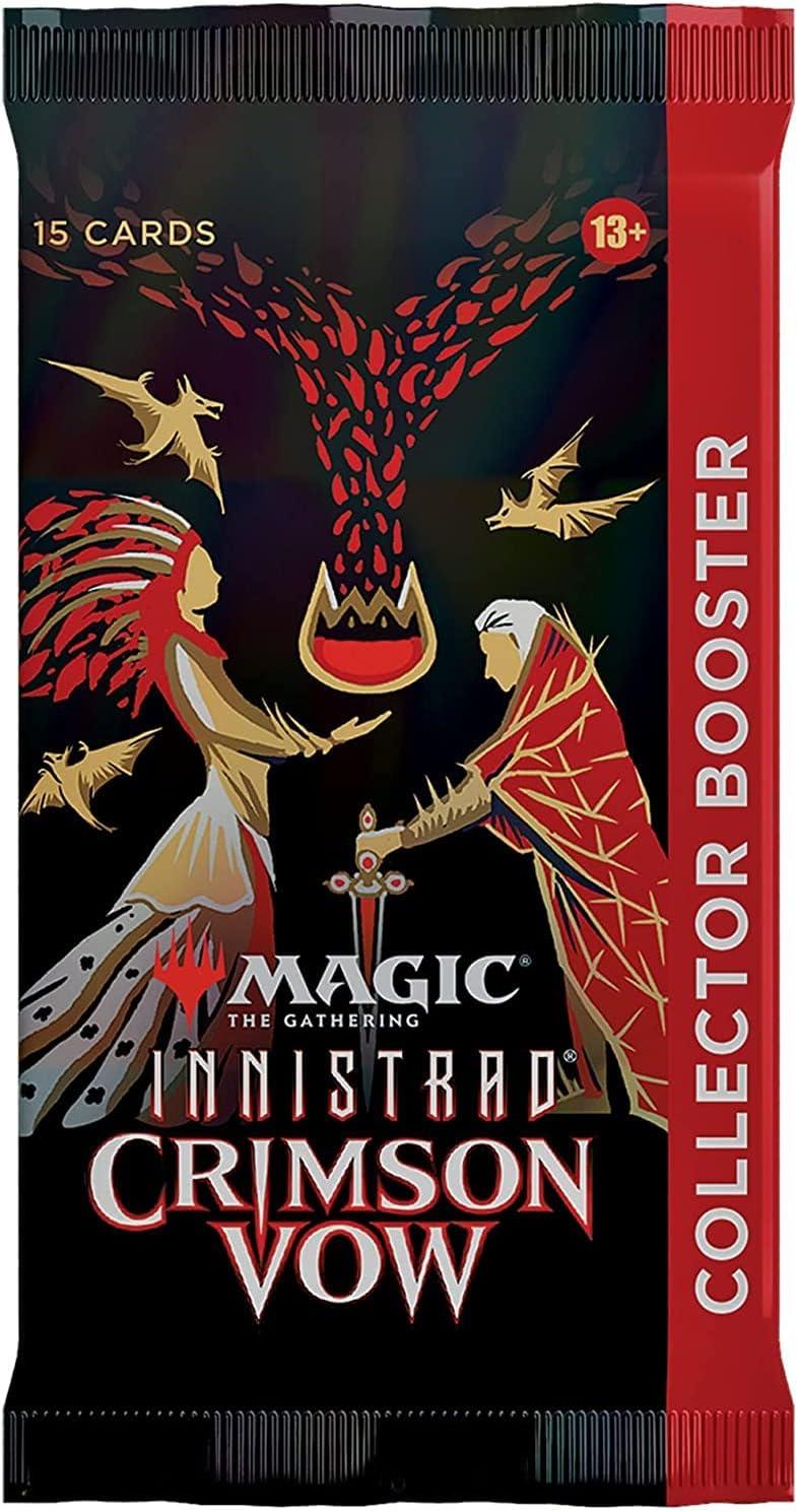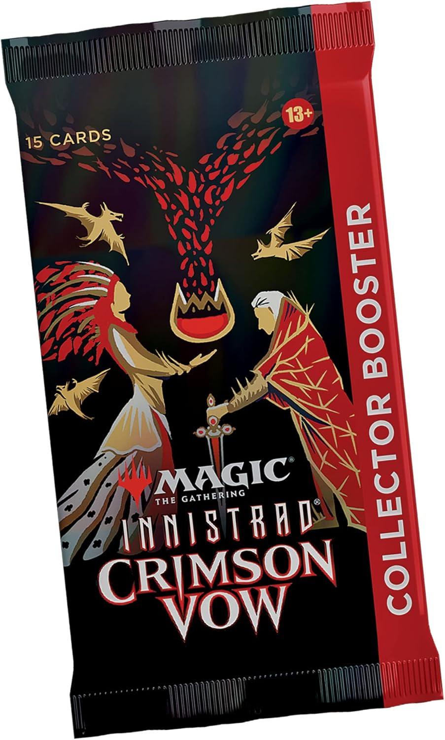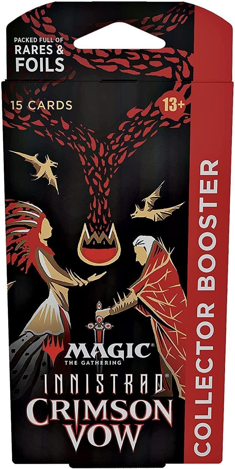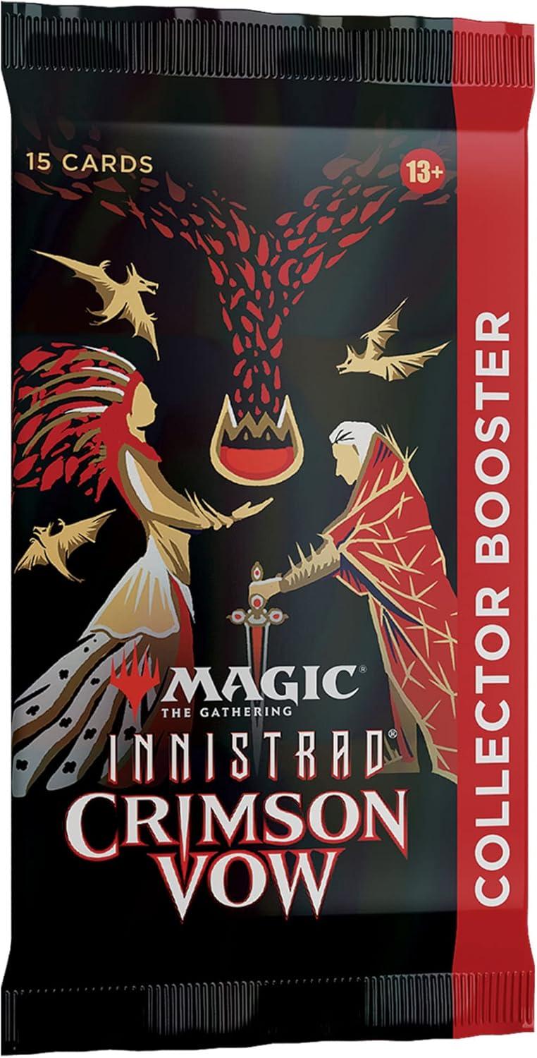 The Innistrad: Crimson Vow Collector Booster contains 15 Magic: The Gathering cards and 1 traditional foil double-sided token, with a combination of 5 Rares and/or Mythic Rares, 2–5 Uncommons, 4–7 Commons, and 1 Land card. Every pack includes a total of 10 traditional foil cards and a total of 8 cards with special treatments—including Showcase, Borderless, and Extended-Art cards.