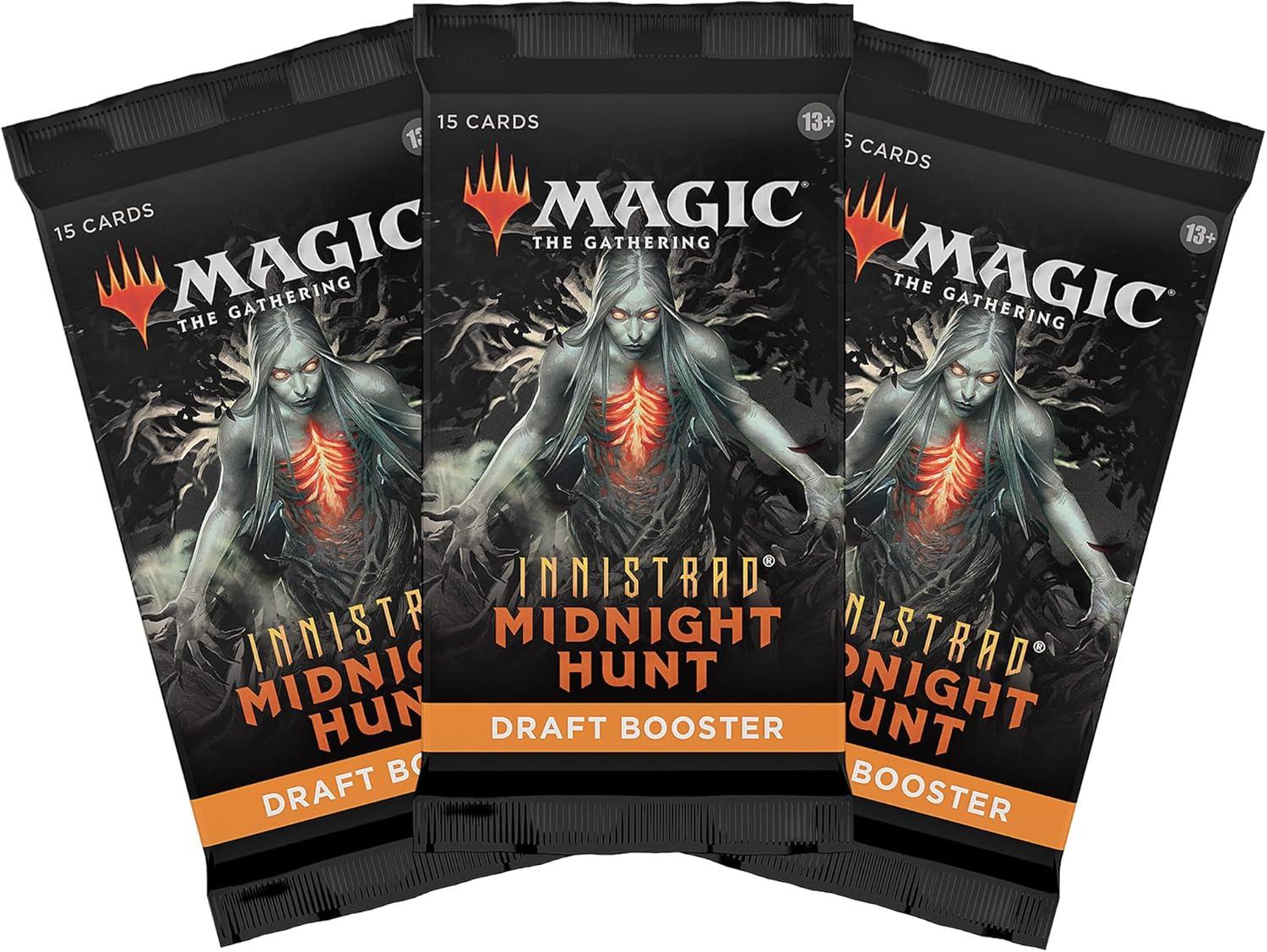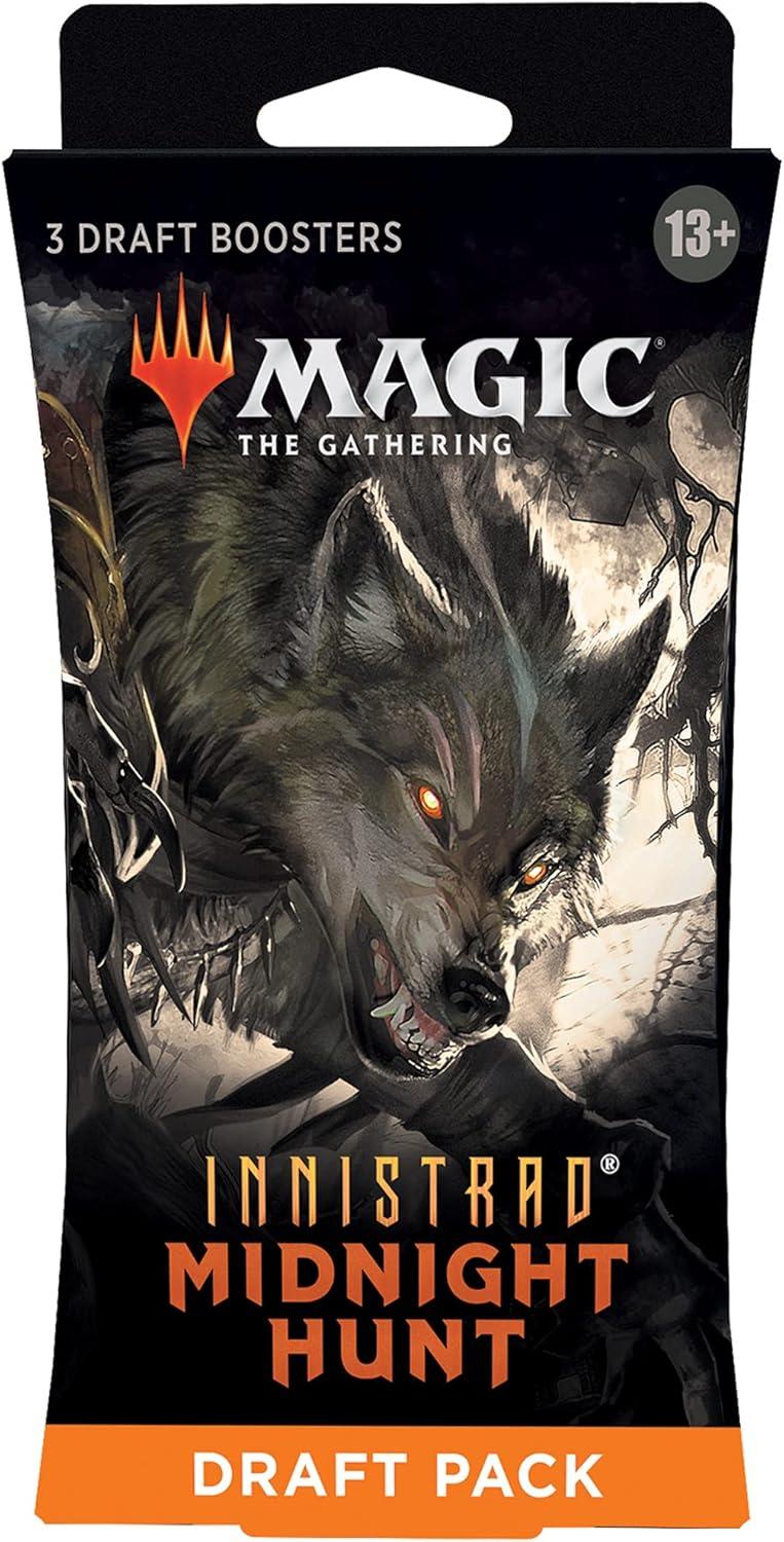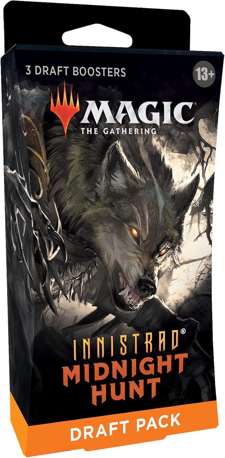The Innistrad: Midnight Hunt Draft Pack contains 3 Innistrad: Midnight Hunt Draft Boosters, each with 15 Magic cards, 1 token or ad card, and 1 Helper card, with 1 Rare or Mythic Rare, 3 Uncommon, 10 Common, and 1 Eternal Night Full-Art Basic Land cards. A double- or single-faced traditional foil card of any rarity replaces a Common in 33% of Innistrad: Midnight Hunt Draft Boosters.