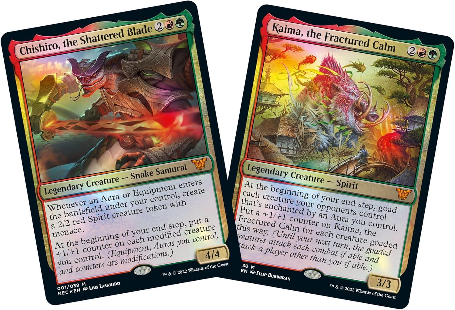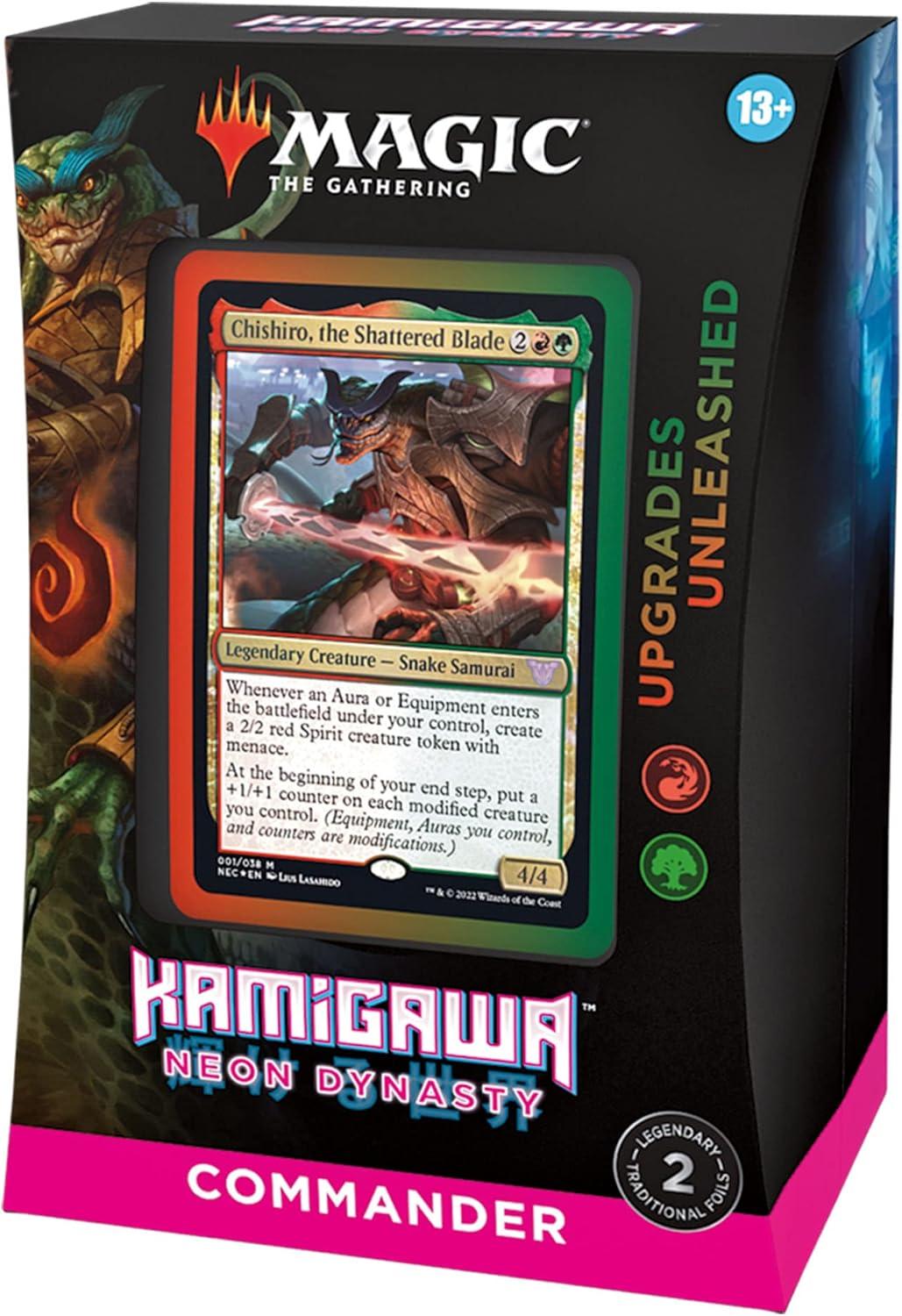 The Upgrades Unleashed Kamigawa: Neon Dynasty Commander Deck set includes 1 ready-to-play deck of 100 Magic cards (2 traditional foil, 98 nonfoil), 1 foil-etched Display Commander (a thick cardstock copy of the commander card with textured foil etched into the card’s border and art), 10 double-sided tokens, 1 deck box (can hold 100 sleeved cards), 1 life tracker, and 1 reference card. (Note: The Upgrades Unleashed Commander deck was inadvertently printed with two copies of Mossfire Valley instead of an additional basic land. Players wanting to play the deck in Commander should swap out the extra copy of Mossfire Valley for a basic land or the land of their choice.).
