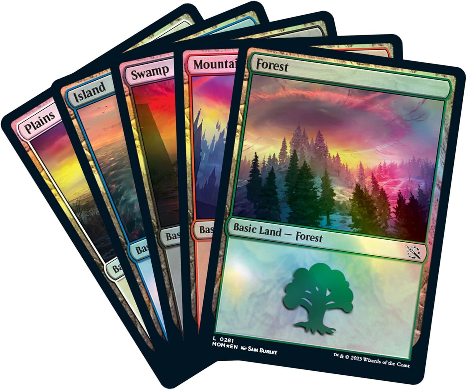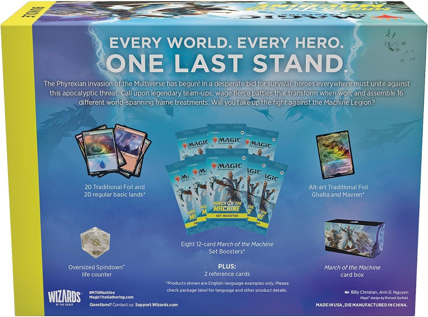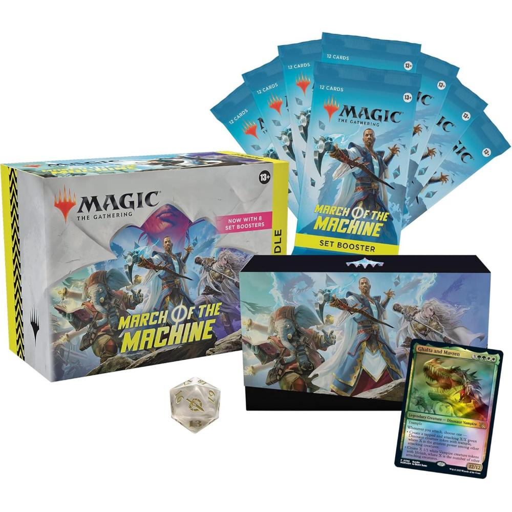 The March of the Machine Bundle contains 8 March of the Machine Set Boosters—the best boosters to open just for fun—plus accessories, with 1 traditional foil alternate-art promo card—Ghalta and Mavren, 40 basic lands (20 traditional foils and 20 nonfoils), 1 oversized Spindown life counter, 1 card storage box, and 2 reference cards. Each Set Booster contains 12 Magic cards, 1 Art Card, and 1 token/ad card, Helper card, or card from “The List” (a special card from Magic's history—found in 25% of packs). Every pack includes a combination of 1–5 card(s) of rarity Rare or higher, and 3–8 Uncommon, 2–7 Common, and 1 Land cards. 1 non–Art Card and non–Land card of any rarity is foil. Traditional Foil Borderless Mythic Planeswalker in <1% of boosters. Foil-Stamped Signature Art Card replaces Art Card in 10% of boosters.