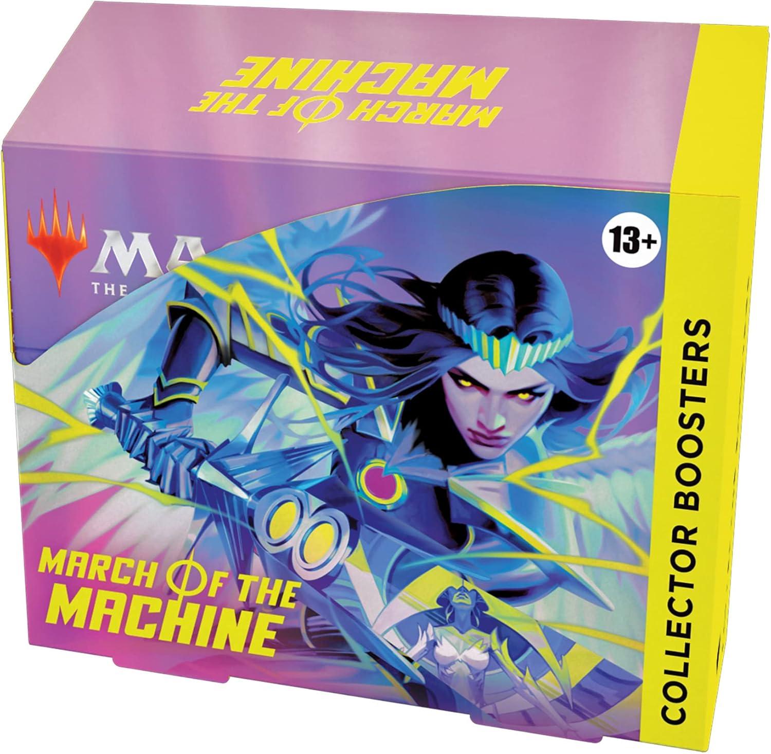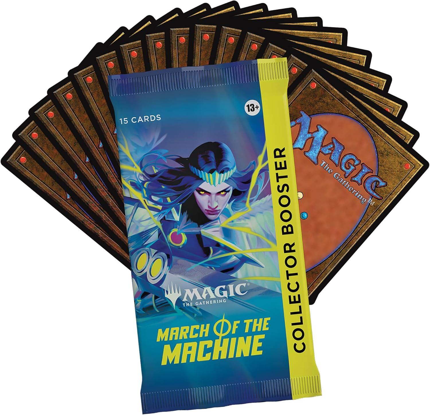 The March of the Machine Collector Booster Box contains 12 March of the Machine Collector Boosters. Each Collector Booster contains 15 Magic: The Gathering cards and 1 Traditional Foil double-sided token, with a combination of 5 cards of rarity Rare or higher and 4 Uncommon, 5 Common, and 1 Land cards. Every pack contains a total of 10–12 Traditional Foil cards.