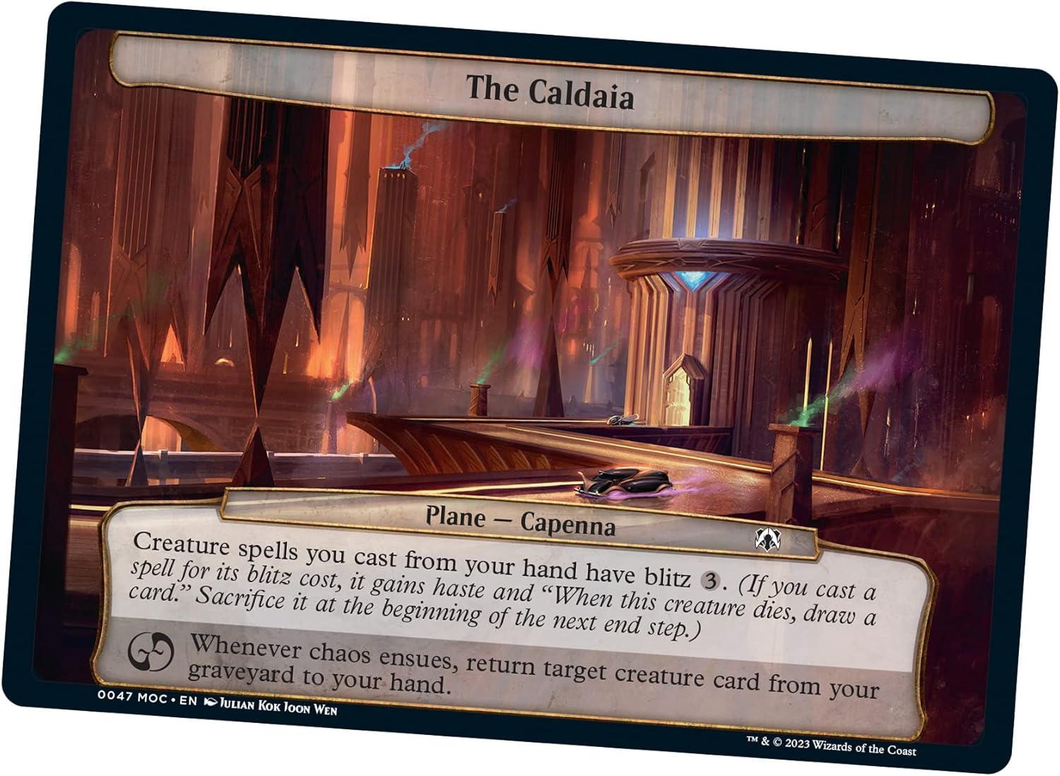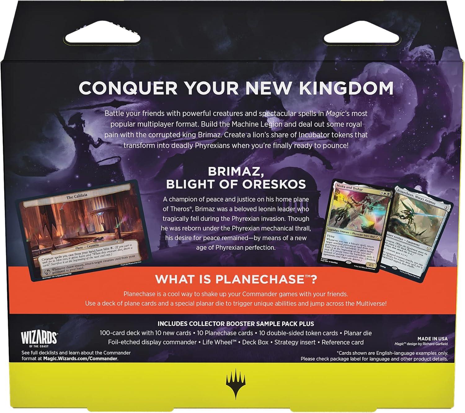 The Growing Threat March of the Machine Commander Deck set includes 1 ready-to-play White-Black deck of 100 Magic cards (2 Traditional Foil Legendary cards, 98 nonfoil cards), 10 Planechase cards, 1 six-sided planar die, a 2-card Collector Booster Sample Pack (contains 1 Traditional Foil or nonfoil special treatment card of rarity Rare or higher and 1 Traditional Foil special treatment Common or Uncommon card), 1 Foil-Etched Display Commander (a thick cardstock copy of the commander card with foil etched into the card’s border and art), 10 double-sided tokens, 1 deck box (can hold 100 sleeved cards), 1 Life Wheel, 1 strategy insert, and 1 reference card.