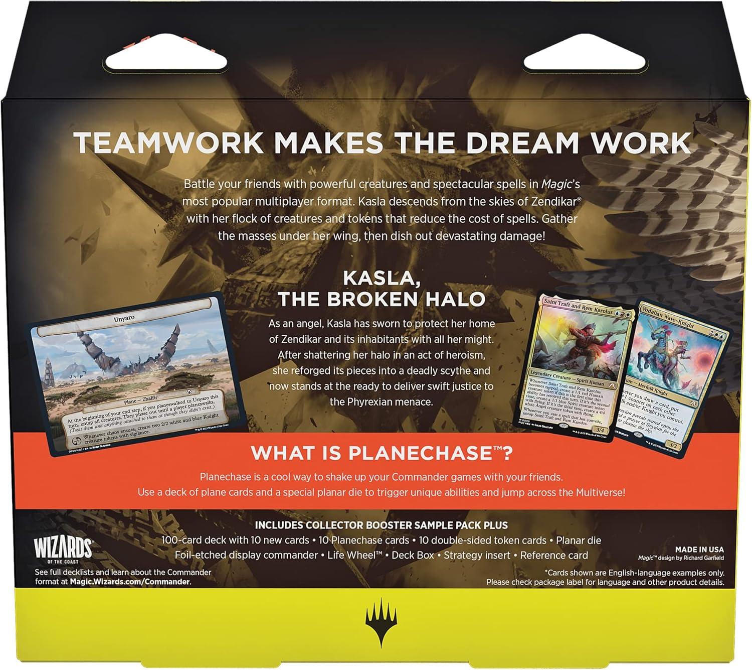 The Growing Threat March of the Machine Commander Deck set includes 1 ready-to-play White-Black deck of 100 Magic cards (2 Traditional Foil Legendary cards, 98 nonfoil cards), 10 Planechase cards, 1 six-sided planar die, a 2-card Collector Booster Sample Pack (contains 1 Traditional Foil or nonfoil special treatment card of rarity Rare or higher and 1 Traditional Foil special treatment Common or Uncommon card), 1 Foil-Etched Display Commander (a thick cardstock copy of the commander card with foil etched into the card’s border and art), 10 double-sided tokens, 1 deck box (can hold 100 sleeved cards), 1 Life Wheel, 1 strategy insert, and 1 reference card.