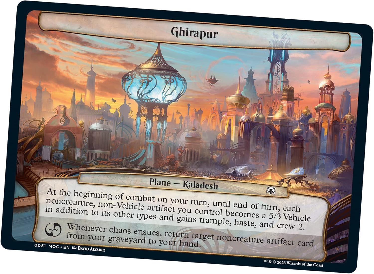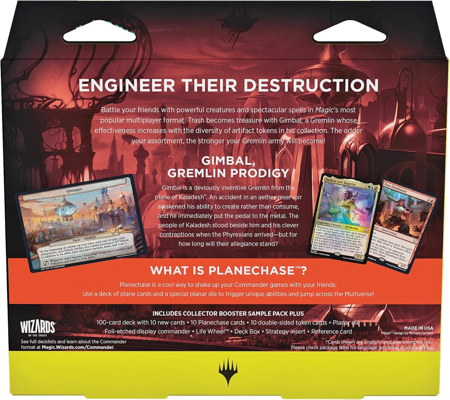 The Growing Threat March of the Machine Commander Deck set includes 1 ready-to-play White-Black deck of 100 Magic cards (2 Traditional Foil Legendary cards, 98 nonfoil cards), 10 Planechase cards, 1 six-sided planar die, a 2-card Collector Booster Sample Pack (contains 1 Traditional Foil or nonfoil special treatment card of rarity Rare or higher and 1 Traditional Foil special treatment Common or Uncommon card), 1 Foil-Etched Display Commander (a thick cardstock copy of the commander card with foil etched into the card’s border and art), 10 double-sided tokens, 1 deck box (can hold 100 sleeved cards), 1 Life Wheel, 1 strategy insert, and 1 reference card.