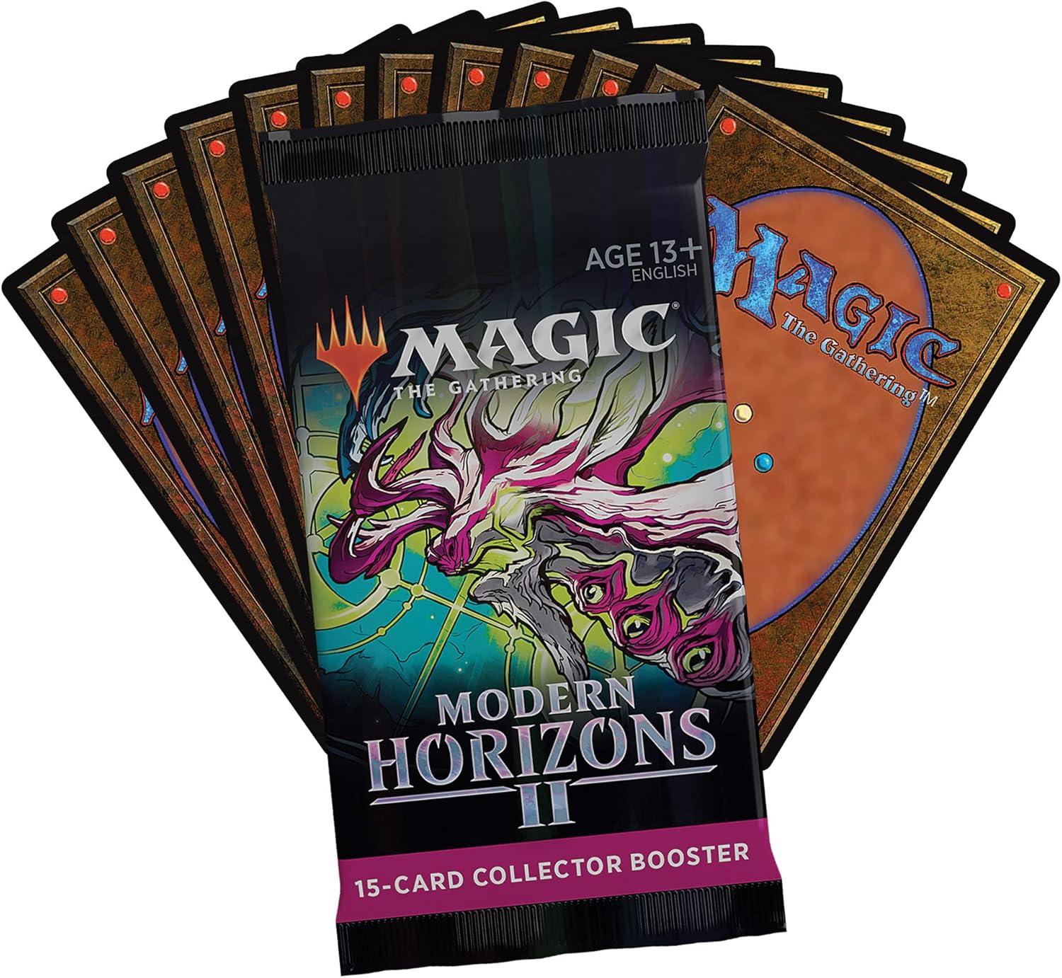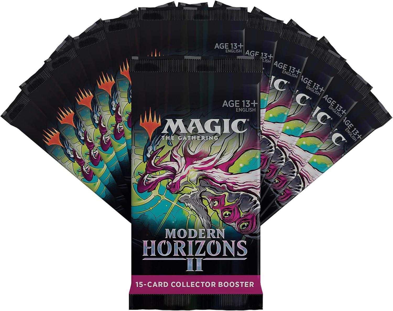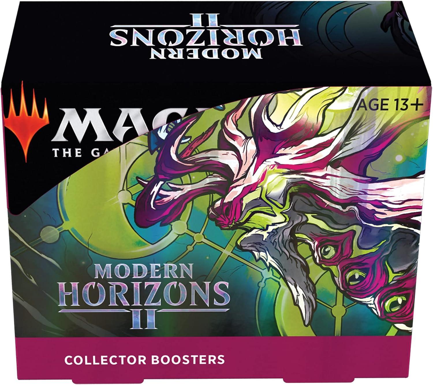 The Modern Horizons 2 Collector Booster Box contains 12 Modern Horizons 2 Collector Boosters. Each pack contains a total of 15 Magic cards and 1 traditional foil double-sided token, including 3 Foil Etched cards and 9 traditional foils. Get a combination of 4 Rare and Mythic Rares (max. of 3 may be Mythic), 2–6 Uncommons, 4–8 Commons, and 1 Land card in every Modern Horizons 2 Collector Booster.