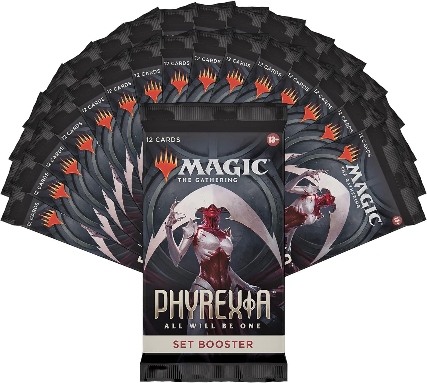 The Phyrexia: All Will Be One Set Booster Box contains 30 Phyrexia: All Will Be One Set Boosters. Each Set Booster contains 12 Magic cards, 1 Art Card, and 1 token/ad card or card from “The List” (a special card from Magic's history or Universes Within card—found in 25% of packs).