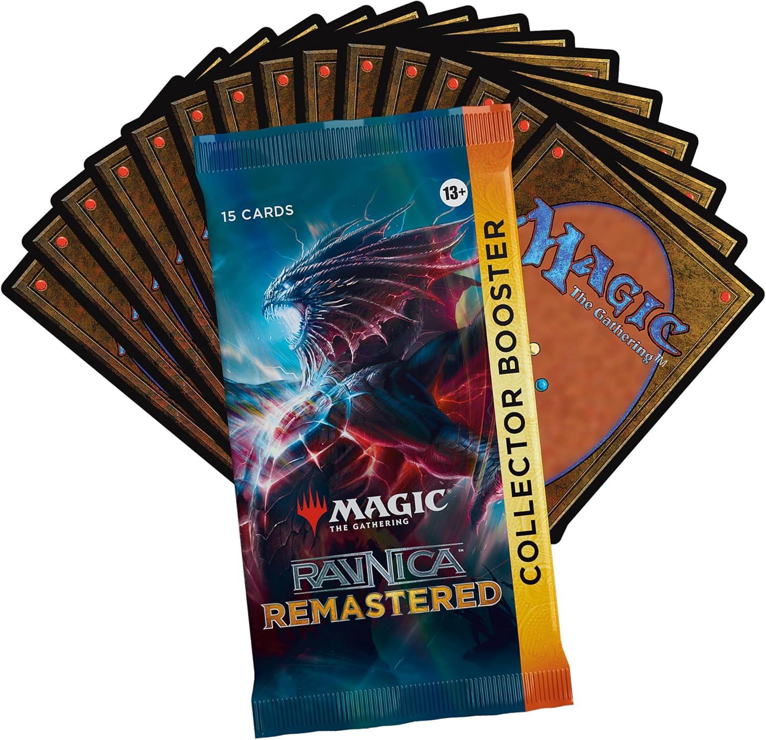 This Ravnica Remastered Collector Booster Box contains 12 Ravnica Remastered Collector Boosters. Each Collector Booster contains 15 Magic: The Gathering cards and 1 Traditional Foil double-sided token, with a combination of 4–5 cards of rarity Rare or higher, 3–7 Uncommon, and 4–8 Common cards. Every pack contains a total of 11 Traditional Foil cards. Serialized Double Rainbow Foil Retro card in 1% of boosters.