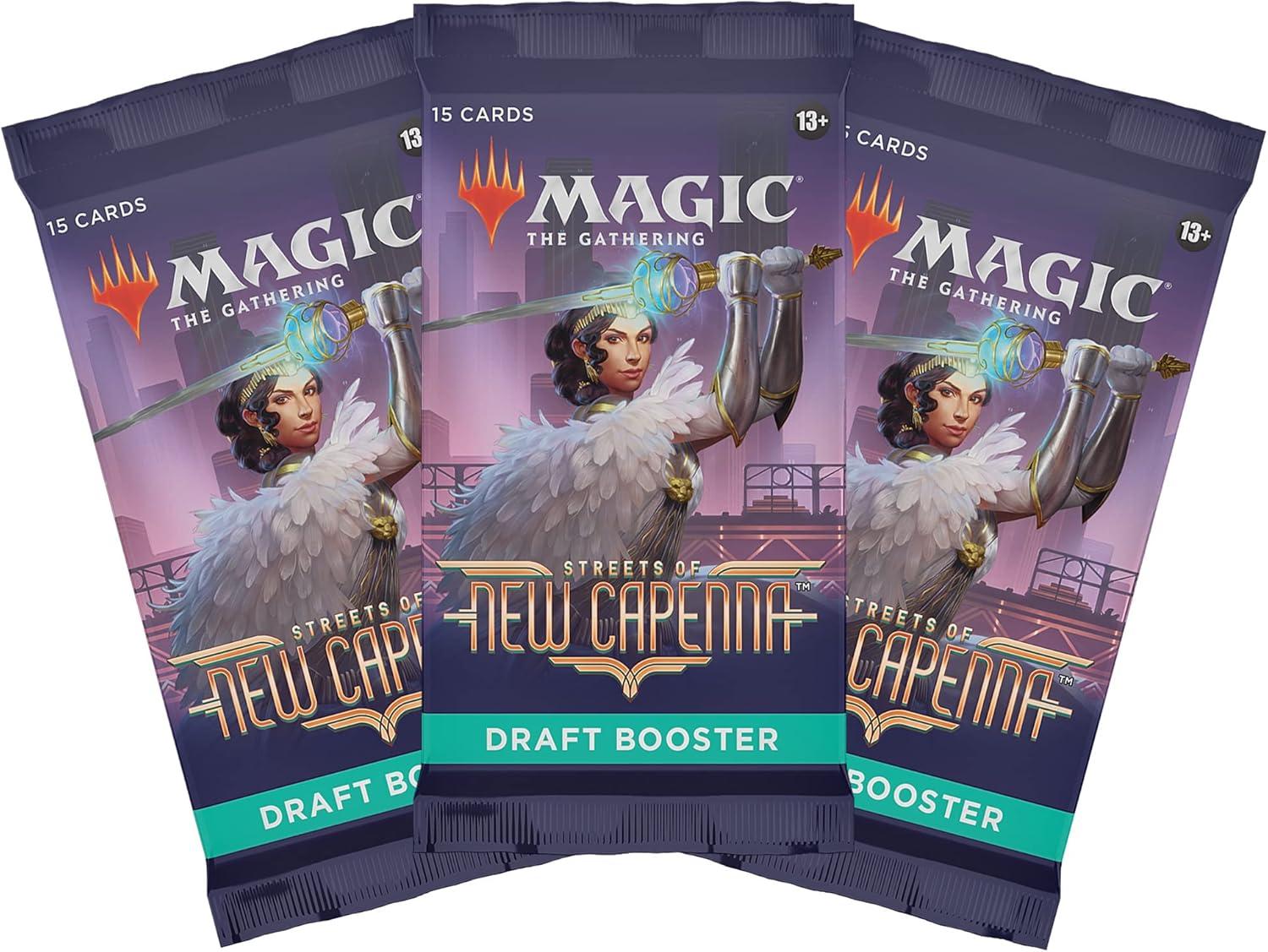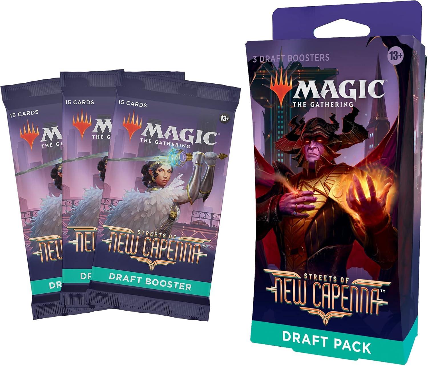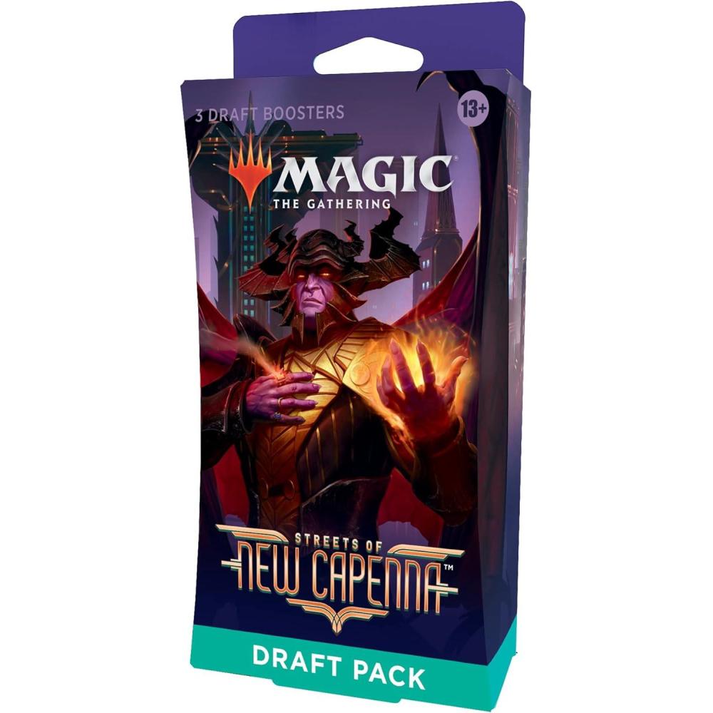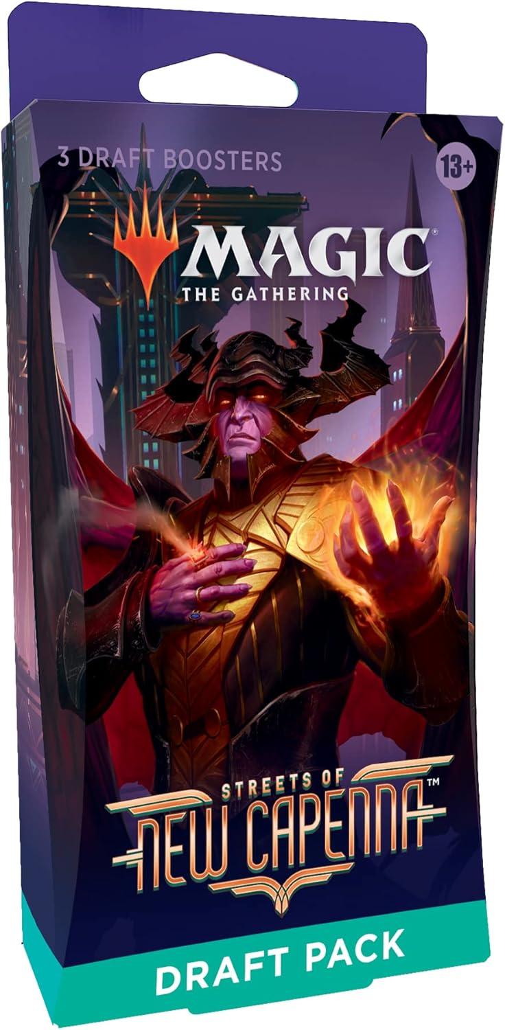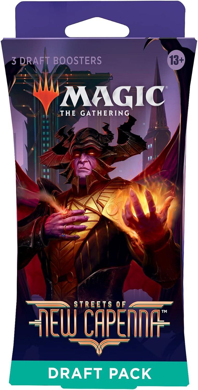 The Streets of New Capenna Draft Pack contains 3 Streets of New Capenna Draft Boosters. Draft Boosters are specifically designed for the best Magic: The Gathering booster draft play experience. Each pack contains 15 Magic cards and 1 token, ad card, or counter punchout card, with a combination of 1 card of rarity Rare or higher and 3 Uncommon, 10 Common, and 1 Land cards (Metropolis Full-Art Land in 33% of packs). A traditional foil card of any rarity replaces a Common in 33% of Streets of New Capenna Draft Boosters. Traditional foil Borderless Mythic Planeswalker in <1% of boosters.