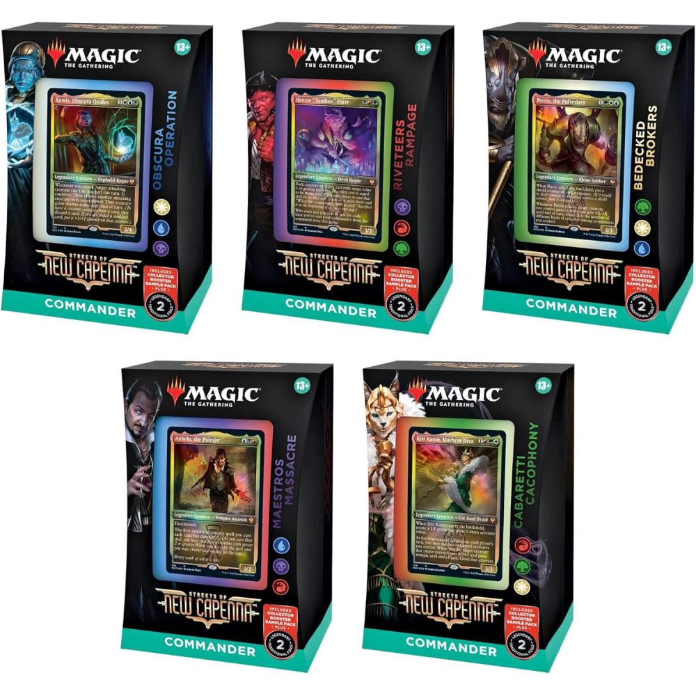 This bundle includes all five Streets of New Capenna Commander Decks—Obscura Operation (White-Blue-Black), Maestros Massacre (Blue-Black-Red), Riveteers Rampage (Black-Red-Green), Cabaretti Cacophony (Red-Green-White), Bedecked Brokers (Green-White-Blue). Each deck set comes with a 2-card Collector Booster Sample Pack, 1 ready-to-play deck of 100 Magic cards (2 traditional foil, 98 nonfoil), 1 foil-etched Display Commander (a thick cardstock copy of the commander card with foil etched into the card’s border and art), 10 double-sided tokens, 1 deck box (can hold 100 sleeved cards), 1 life tracker, and 1 reference card.