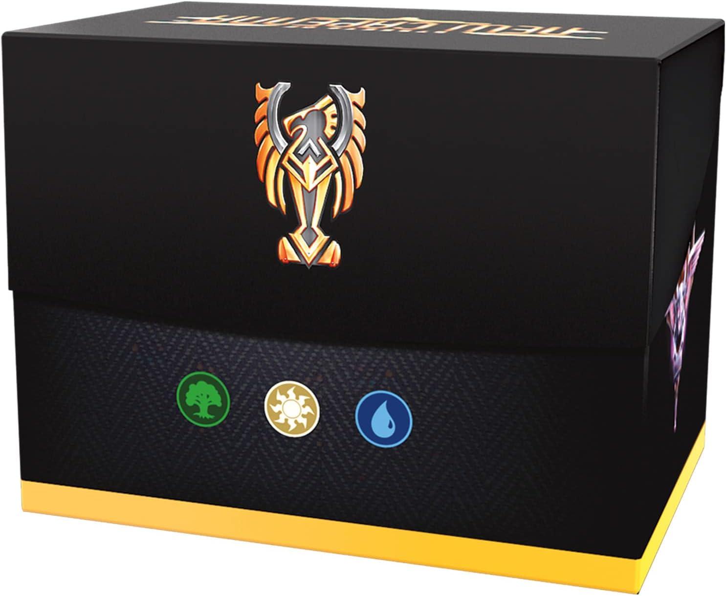 This minimally-packaged version of the Bedecked Brokers Streets of New Capenna Commander Deck includes all the same contents but with less packaging waste. Each box contains 1 ready-to-play Green-White-Blue deck of 100 Magic cards (2 traditional foil, 98 nonfoil), a 2-card Collector Booster Sample Pack, 1 foil-etched Display Commander (a thick cardstock copy of the commander card with foil etched into the card’s border and art), 10 double-sided tokens, 1 counter punchout card, 1 deck box (can hold 100 sleeved cards), 1 life tracker, and 1 reference card. Every Collector Booster Sample Pack contains 1 traditional foil Showcase Uncommon or Common card and 1 traditional foil or nonfoil alternate treatment card of rarity Rare or higher).