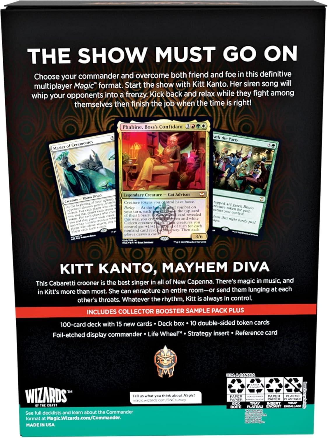 The Cabaretti Cacophony Streets of New Capenna Commander Deck set contains 1 ready-to-play Red-Green-White deck of 100 Magic cards (2 traditional foil, 98 nonfoil), a 2-card Collector Booster Sample Pack, 1 foil-etched Display Commander (a thick cardstock copy of the commander card with foil etched into the card’s border and art), 10 double-sided tokens, 1 counter punchout card, 1 deck box (can hold 100 sleeved cards), 1 life tracker, and 1 reference card. Every Collector Booster Sample Pack contains 1 traditional foil Showcase Uncommon or Common card and 1 traditional foil or nonfoil alternate treatment card of rarity Rare or higher).