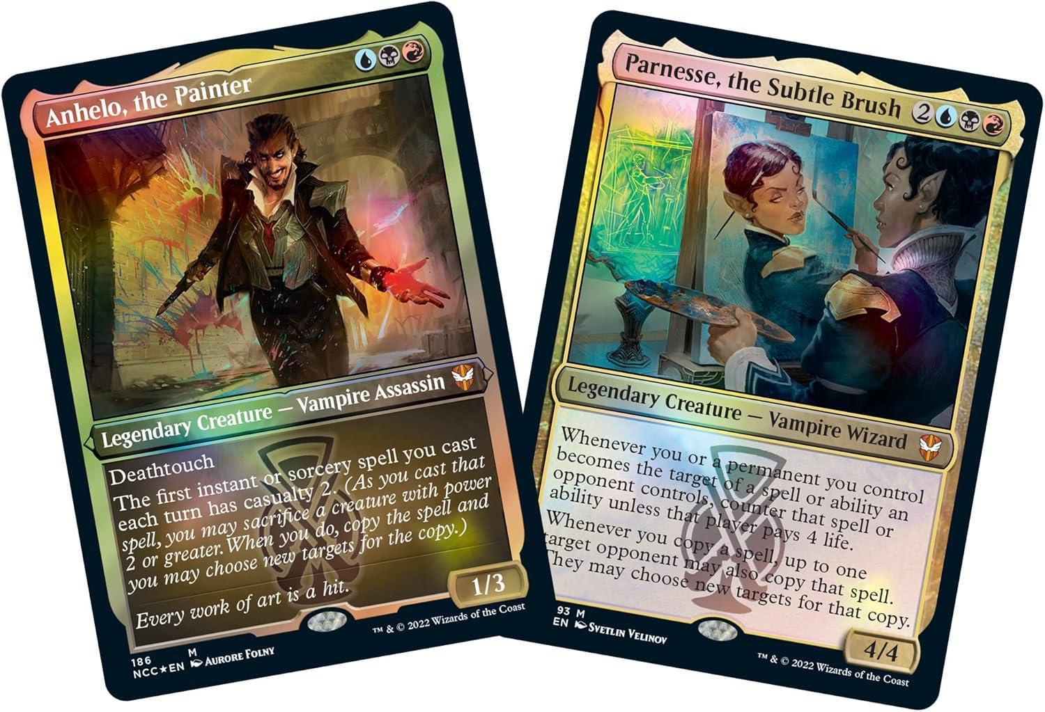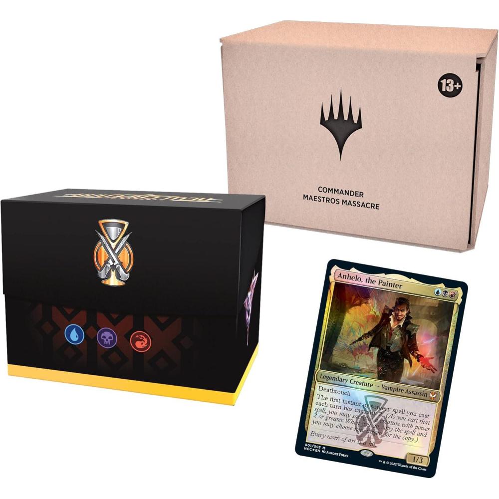 This minimally-packaged version of the Maestros Massacre Streets of New Capenna Commander Deck includes all the same contents but with less packaging waste. Each box contains 1 ready-to-play Blue-Black-Red deck of 100 Magic cards (2 traditional foil, 98 nonfoil), a 2-card Collector Booster Sample Pack, 1 foil-etched Display Commander (a thick cardstock copy of the commander card with foil etched into the card’s border and art), 10 double-sided tokens, 1 counter punchout card, 1 deck box (can hold 100 sleeved cards), 1 life tracker, and 1 reference card. Every Collector Booster Sample Pack contains 1 traditional foil Showcase Uncommon or Common card and 1 traditional foil or nonfoil alternate treatment card of rarity Rare or higher).