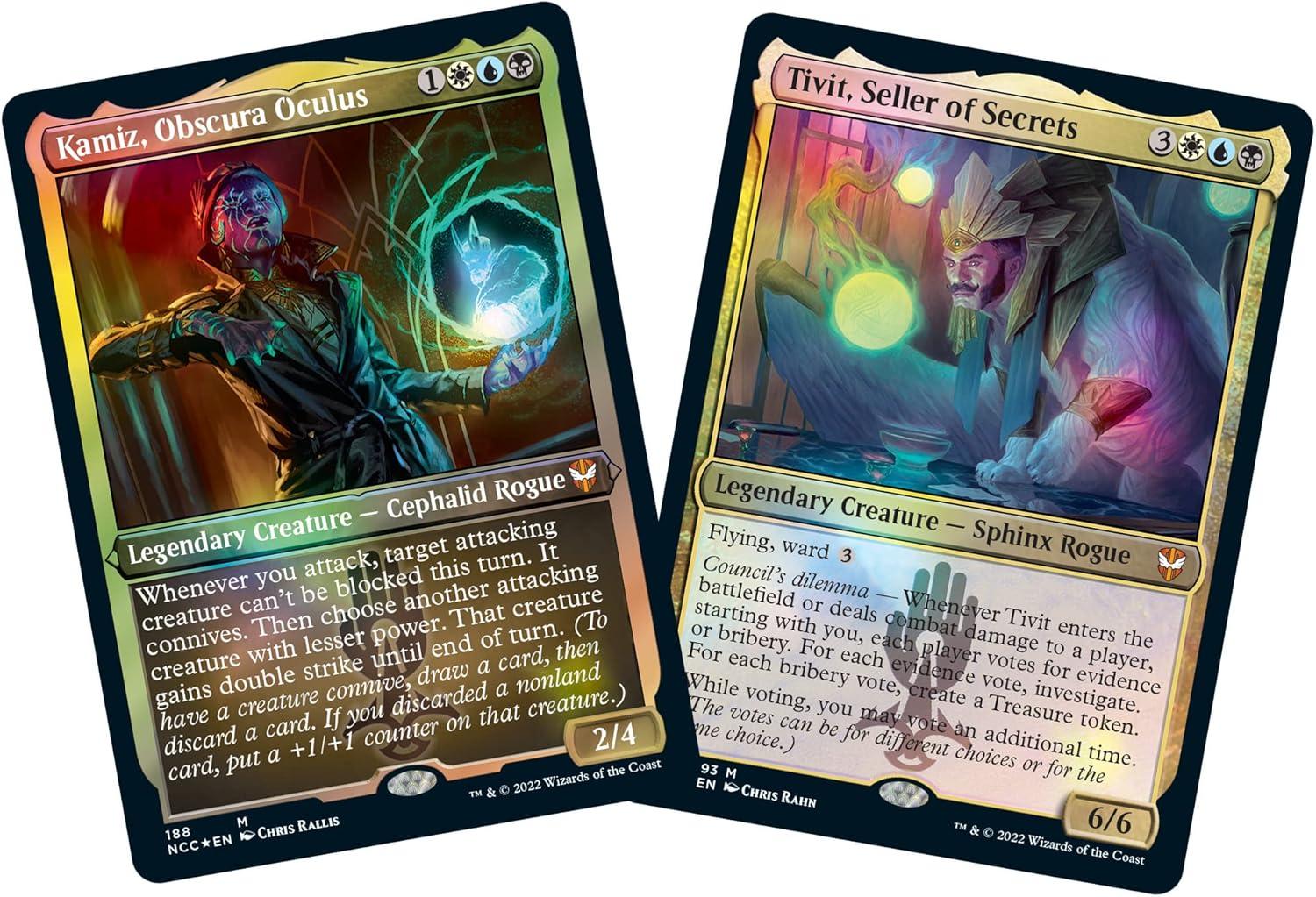 The Obscura Operation Streets of New Capenna set contains 1 ready-to-play White-Blue-Black deck of 100 Magic cards (2 traditional foil, 98 nonfoil), a 2-card Collector Booster Sample Pack, 1 foil-etched Display Commander (a thick cardstock copy of the commander card with foil etched into the card’s border and art), 10 double-sided tokens, 1 counter punchout card, 1 deck box (can hold 100 sleeved cards), 1 life tracker, and 1 reference card. Every Collector Booster Sample Pack contains 1 traditional foil Showcase Uncommon or Common card and 1 traditional foil or nonfoil alternate treatment card of rarity Rare or higher).