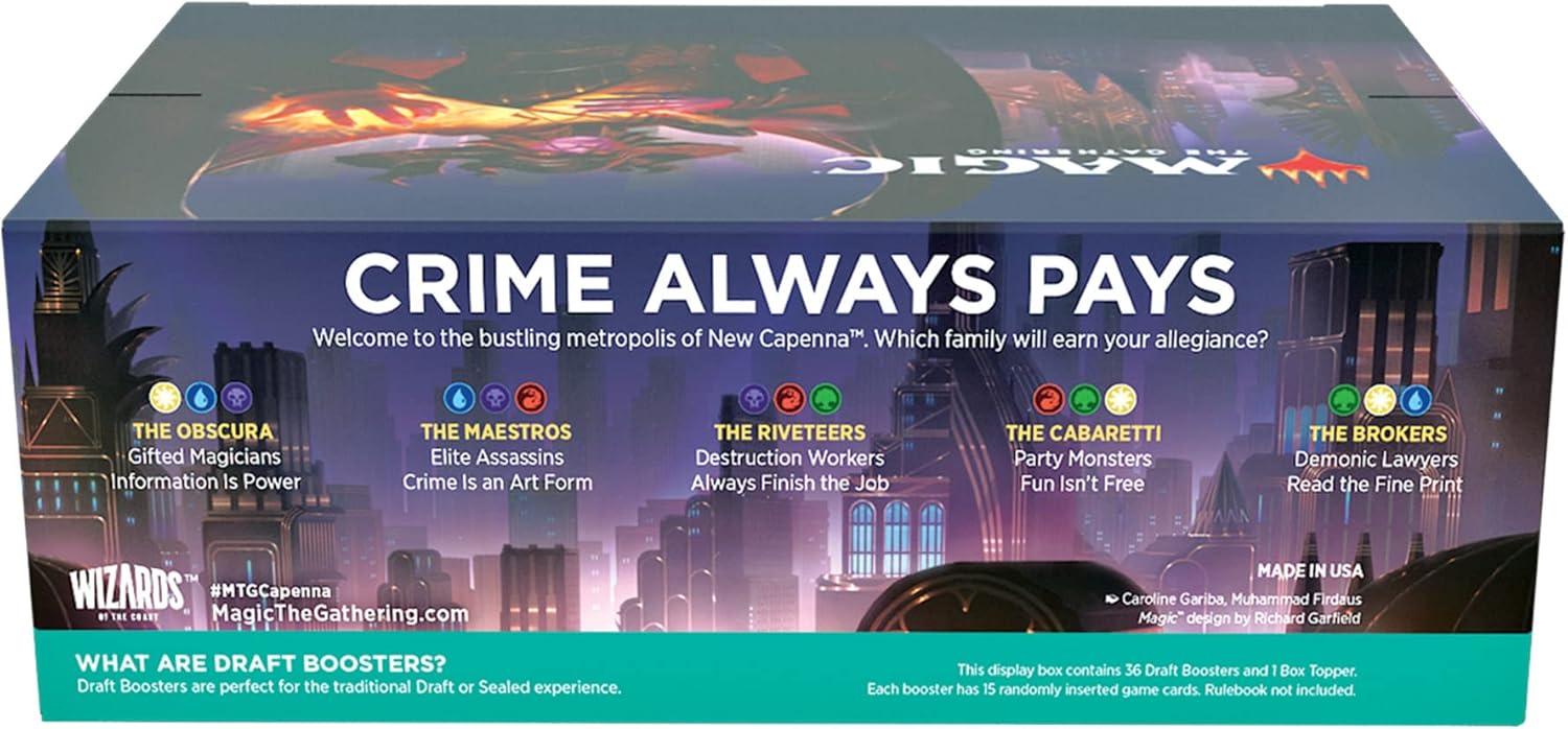 The Streets of New Capenna Draft Booster Box contains 36 Streets of New Capenna Draft Boosters and 1 1 traditional foil alternate-art box topper card—Gala Greeters. Draft Boosters are specifically designed for the best Magic: The Gathering booster draft play experience. Each pack contains 15 Magic cards and 1 token, ad card, or counter punchout card, with a combination of 1 card of rarity Rare or higher and 3 Uncommon, 10 Common, and 1 Land cards (Metropolis Full-Art Land in 33% of packs). A traditional foil card of any rarity replaces a Common in 33% of Streets of New Capenna Draft Boosters. Traditional foil Borderless Mythic Planeswalker in <1% of boosters.