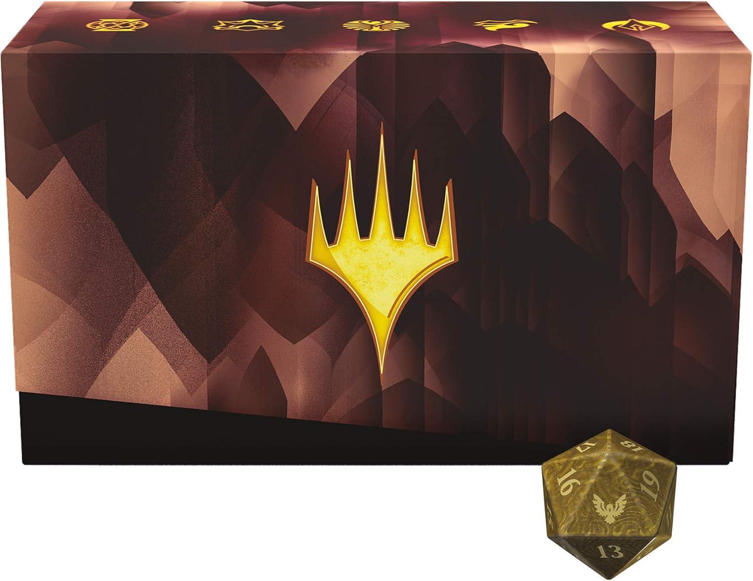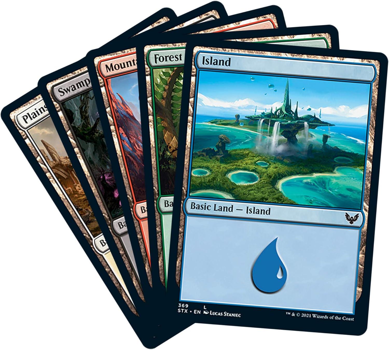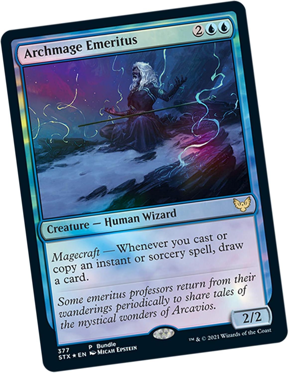 The Strixhaven: School of Mages Bundle contains 10 Strixhaven Draft Boosters, 2 land packs with 40 basic lands from the Strixhaven setting (20 in foil and 20 nonfoil), 1 foil alt-art promo card, 1 oversized Spindown life counter, 1 card storage box, and 2 reference cards. Each of the 10 Strixhaven Draft Boosters contain 15 Magic cards and 1 ad/token or Helper Card (for use with Double-Faced Cards). Each pack contains 1 Mystical Archive card (Uncommon, Rare, or Mythic Rare), 1 Lesson card (Common, Rare, or Mythic Rare), 1 Rare or Mythic Rare, 3 Uncommons, and 9 Commons. A traditional foil card of any rarity replaces a Common in 33% of Strixhaven Draft Boosters, and a foil Mystical Archive Mythic Rare can be found in <1% of packs.