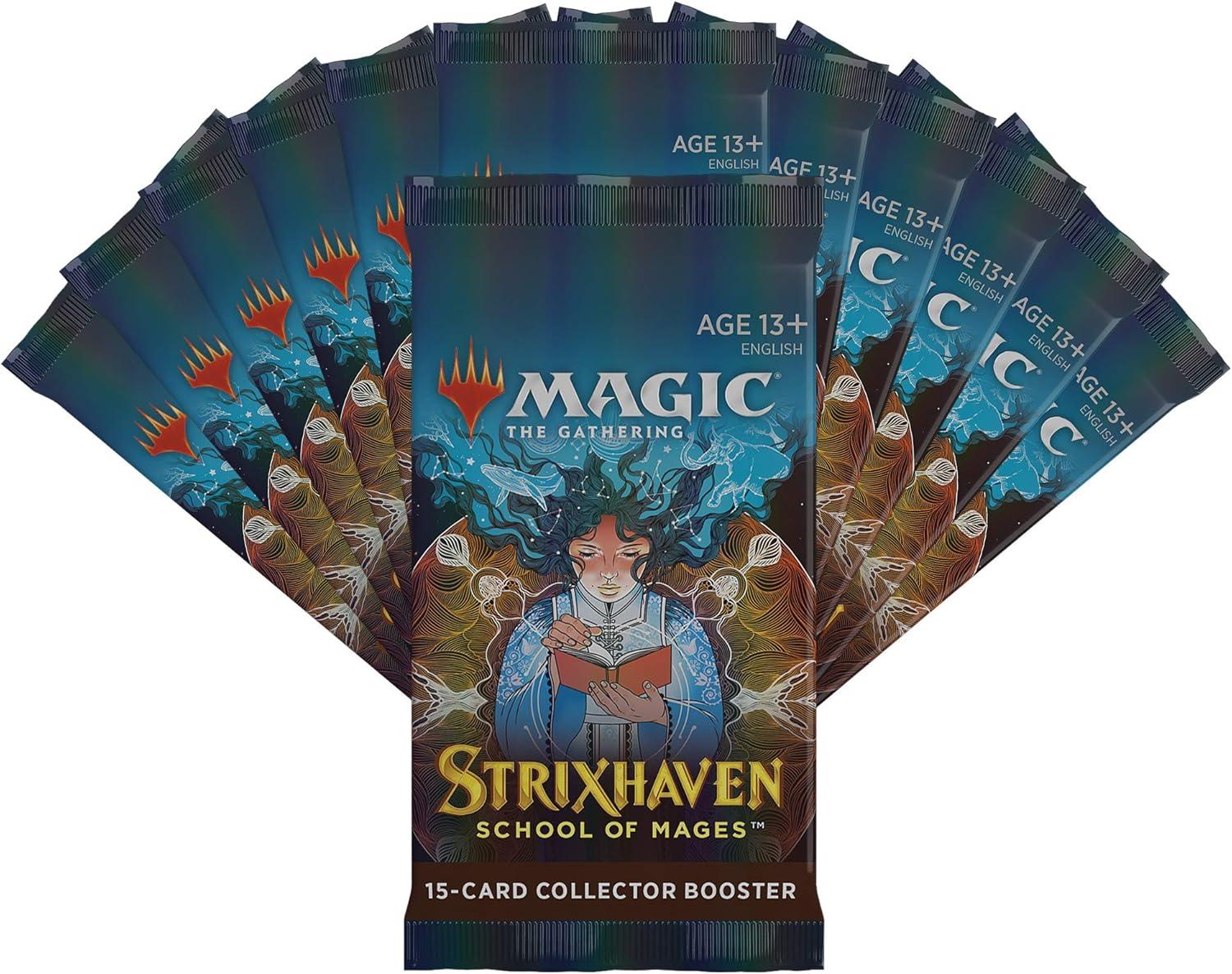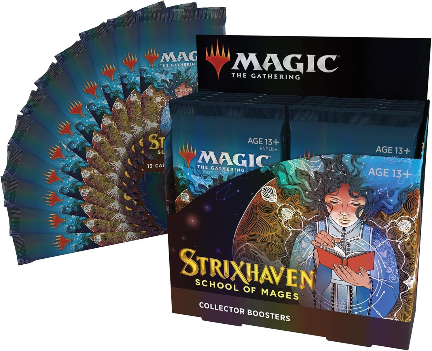 The Strixhaven: School of Mages Collector Booster Box contains 12 Strixhaven Collector Boosters. Each pack contains 15 Magic cards and 1 foil double-sided token, with a combination of 5–6 Rare or Mythic Rare cards, 4–5 Uncommons, and 5–6 Commons (2 foil etched cards, 11 traditional foils, and 2 nonfoils). Every Strixhaven Collector Booster contains a total of 6 cards with special alt-frame treatments, including 1–3 Extended Art cards, 0–2 Borderless cards, and 3–4 Mystical Archive cards (2 foil etched and 1–2 traditional foils, with 1–3 Japanese alt-art variants). One foil etched Mystical Archive Rare, Mythic Rare, or Uncommon is always a foil etched Japanese alt-art Mystical Archive card.