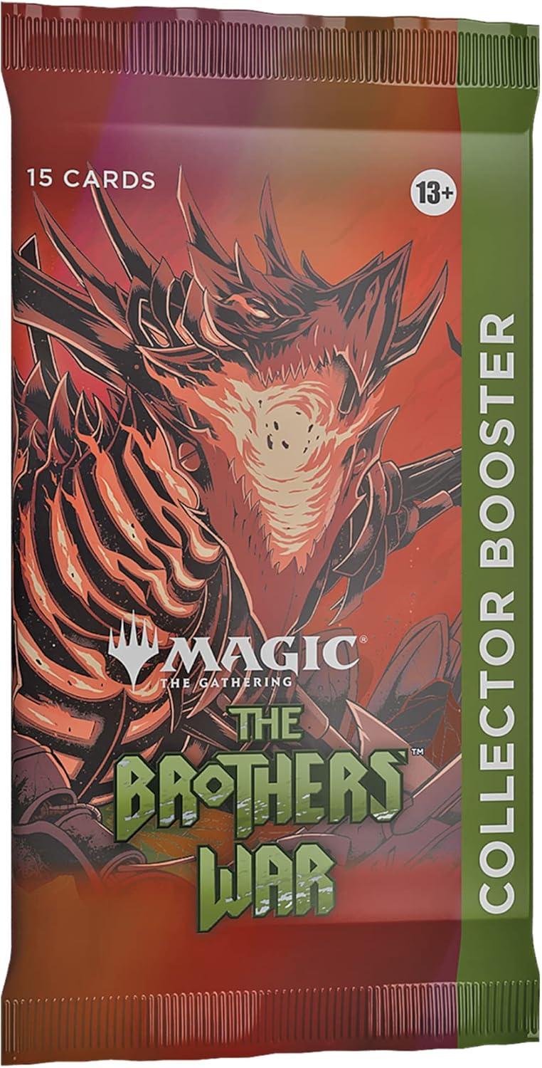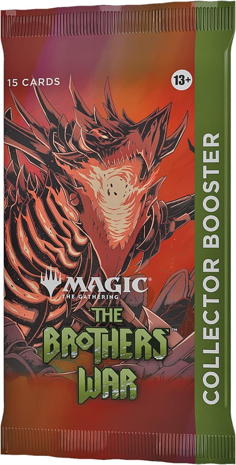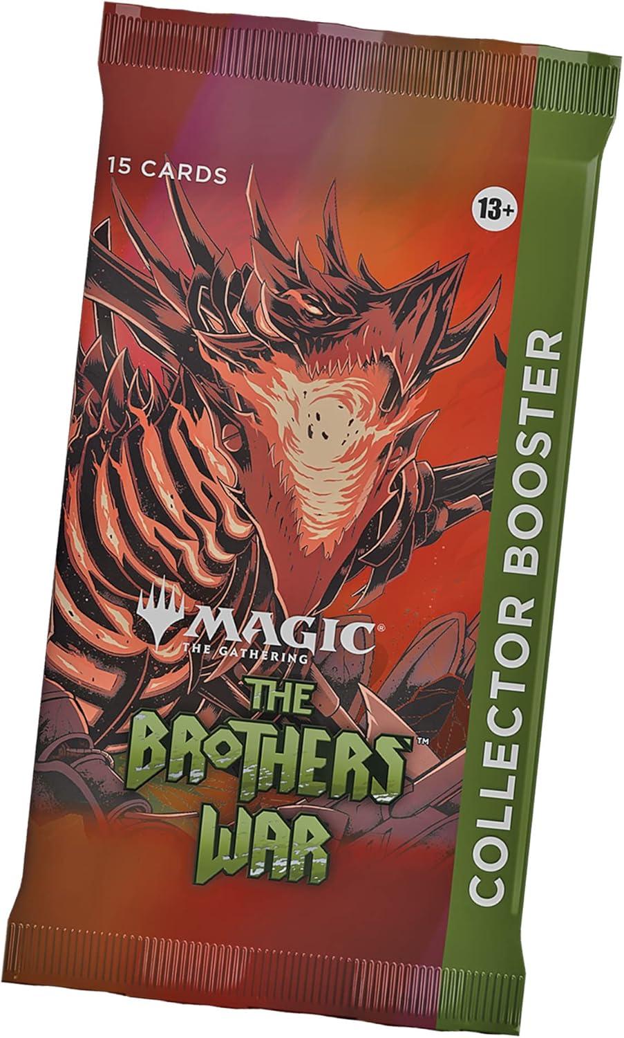 Every The Brothers’ War Collector Booster contains 15 Magic: The Gathering cards and 1 Traditional Foil double-sided token, with 1 Universes Beyond Transformers Mythic Rare card (Shattered Glass alternate-art in 12% of packs), 5 cards of rarity Rare or higher and 4 Uncommon, 4 Common, and 1 Land cards. Every pack contains a total of 10–11 Traditional Foil cards and a total of 3–4 Retro-Frame Artifact cards, with at least 1 Retro-Frame Schematic Artifact card in every pack. Foil Serialized Schematic card in <1% of boosters.