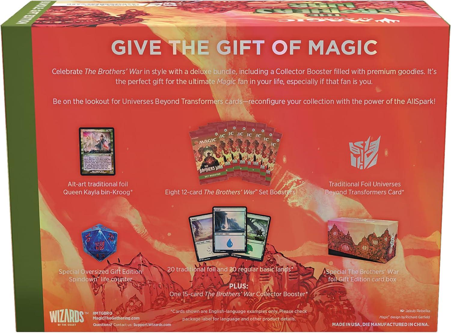 Celebrate The Brothers' War with a deluxe bundle full of exclusive accessories and cards that will transport fans back to beloved styles and storylines from 1990s Magic. On top of the usual Bundle goodies, the Gift Bundle comes with a 15-card Collector Booster, the only boosters that may contain a Shattered Glass alternate-art Transformers card and/or special Double Rainbow Foil Serialized Schematic card. The Gift Bundle is also the only The Brothers’ War product with a guaranteed Universes Beyond Transformers card in Traditional Foil. Every Gift Bundle also includes 8 The Brothers’ War Set Boosters, 1 Traditional Foil Retro-Frame alternate-art promo card—Queen Kayla bin-Kroog, 40 basic lands (20 traditional foils and 20 nonfoils), 1 exclusive oversized Spindown life counter, 1 special Gift Edition foil card storage box, and 2 reference cards. It’s the perfect gift for the ultimate Magic fan in your life, especially if that fan is you.