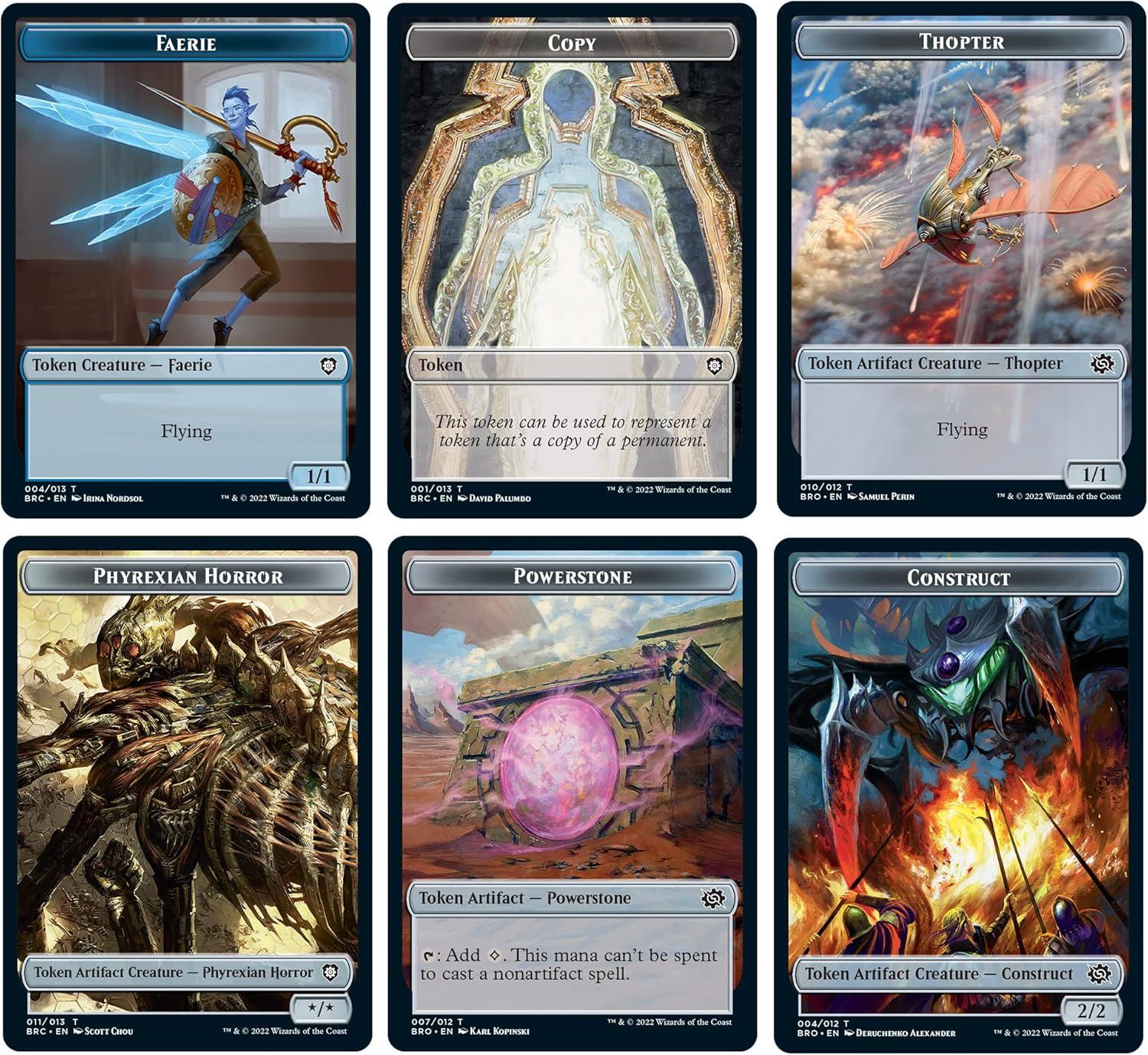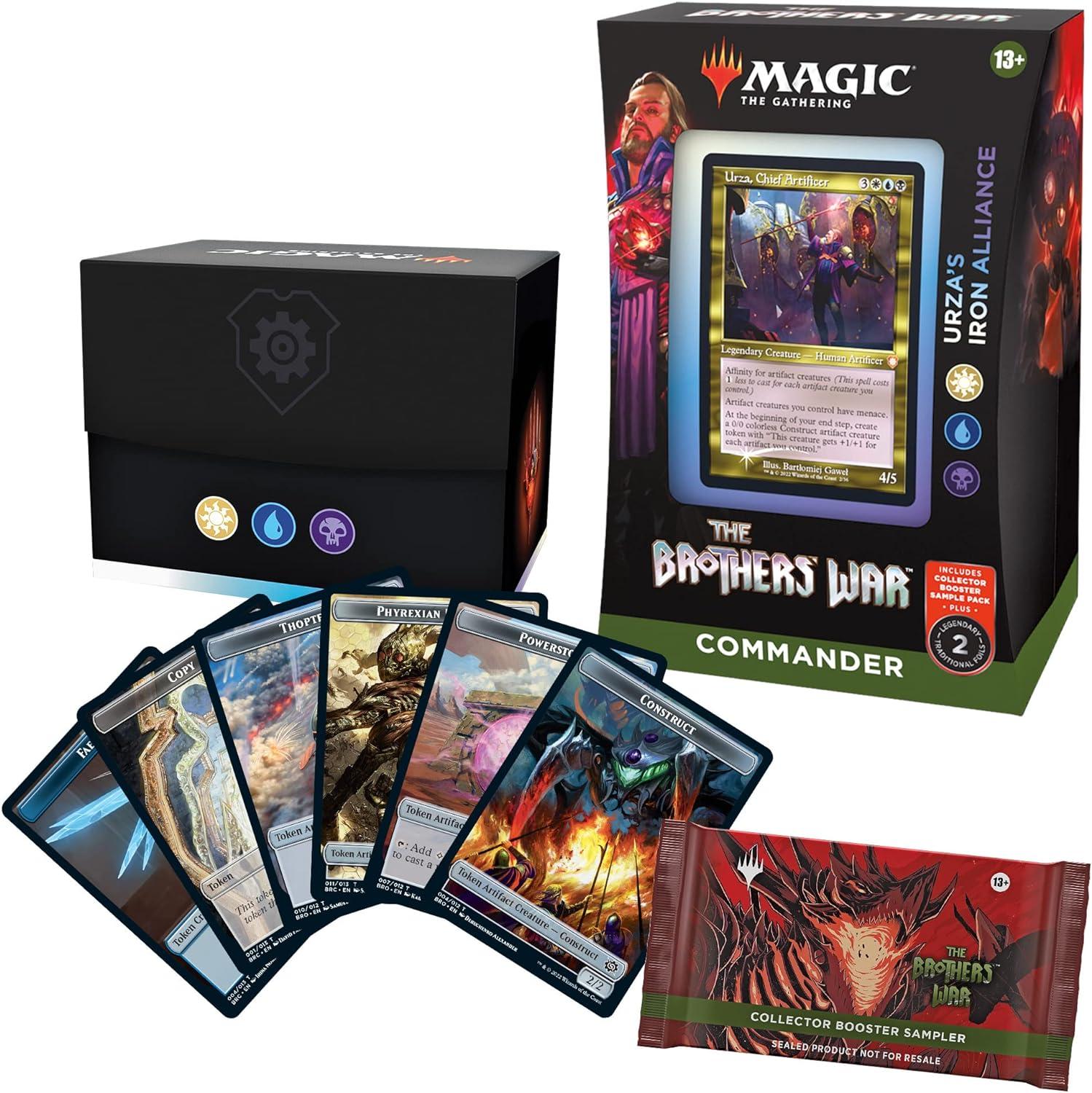 The Brothers’ War Commander Deck set includes 1 ready-to-play deck of 100 Retro-Frame Magic cards (2 Traditional Foil legendary cards, 98 Nonfoil cards), a 2-card Collector Booster Sample Pack (contains 1 Traditional Foil or Nonfoil special treatment card of rarity Rare or higher and 1 Traditional Foil Retro or Schematic Artifact Uncommon card), 1 Traditional Foil Display Commander (a thick cardstock copy of the commander card), 10 double-sided tokens, 1 deck box (can hold 100 sleeved cards), 1 Life Wheel, 1 strategy insert, and 1 reference card.