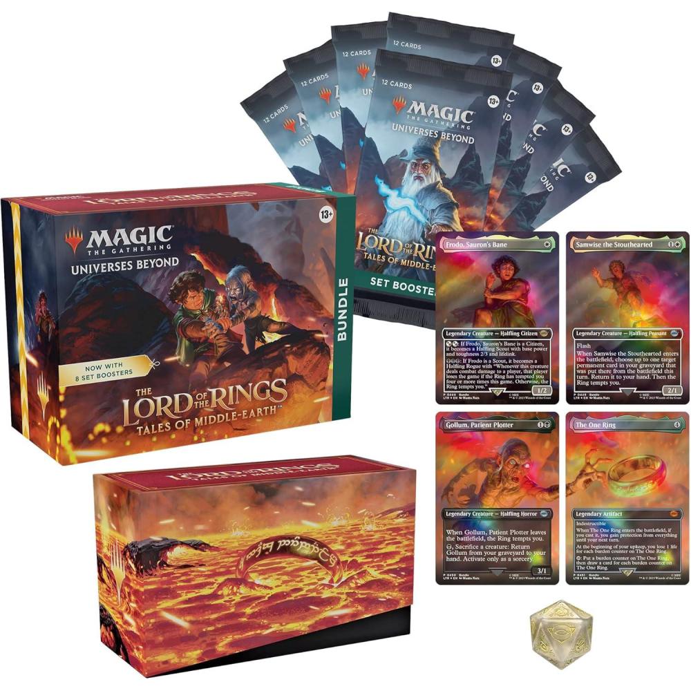 The Lord of the Rings: Tales of Middle-earth Bundle contains 8 The Lord of the Rings: Tales of Middle-earth Set Boosters—the best boosters to open just for fun—plus other The Lord of the Rings-themed goodies, with 4 Traditional Foil Borderless Mount Doom Scene cards, 40 basic land cards (20 Traditional Foils and 20 nonfoils), 1 oversized Spindown for life counter, 1 card storage box, and 2 reference cards. The 4 Mount Doom Scene cards included are alternate-art versions of Frodo, Sauron’s Bane; Samwise the Stouthearted; Gollum, Patient Plotter, and The One Ring. The One Ring Mount Doom Scene card is not the Serialized 1 of 1 Ring (though they are mechanically identical). This product does not contain Serialized Ring cards, including the Serialized Elven, Dwarven, or Human Sol Ring cards, and the 1 of 1 Ring (Serialized 001 of 001). Serialized Elven, Dwarven, and Human Sol Ring cards can only be found in some The Lord of the Rings: Tales of Middle-earth Collector Boosters. The Serialized 1 of 1 Ring was originally in an English Collector Booster but was found on June 30, 2023. Non-serialized Ring cards are mechanically identical to their Serialized versions. Each Set Booster contains 12 Magic cards, 1 Art Card, and 1 token/ad card, Helper card, or card from “The List” (a special card from Magic's history—found in 25% of packs), with a combination of 1–4 card(s) of rarity Rare or higher and 3–7 Uncommon, 3–7 Common, and 1 Land cards. A Traditional Foil Land replaces the basic land in 20% of Set Boosters and a Foil-Stamped Signature Art Card replaces the Art Card in 10% of Set Boosters. A Traditional Foil Borderless Mythic Rare card can be found in <1% of boosters.