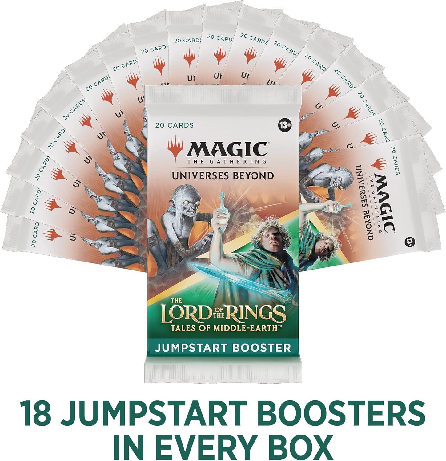 The Lord of the Rings: Tales of Middle-earth Jumpstart Booster Box contains 18 The Lord of the Rings: Tales of Middle-earth Jumpstart Boosters. Each booster has a theme. Just grab two packs and shuffle them together for wild combos and a unique gameplay experience that’s great for a quick game, for long-time fans looking to jump back in, or for a fun way to learn to play. The Lord of the Rings: Tales of Middle-earth Jumpstart Boosters contain 20 Magic cards (including all the lands you need to play). In every pack, you’ll find 2 Rare cards (1 Rare card designed for Jumpstart boosters and 1 Rare or Mythic Rare from the main set), and 2 Land cards with a shining Traditional Foil treatment. This product does not contain Serialized Ring cards, including the Serialized Elven, Dwarven, or Human Sol Ring cards, and the 1 of 1 Ring (Serialized 001 of 001). Serialized Elven, Dwarven, and Human Sol Ring cards can only be found in some The Lord of the Rings: Tales of Middle-earth Collector Boosters. The Serialized 1 of 1 Ring was originally in an English Collector Booster but was found on June 30, 2023. Non-serialized Ring cards are mechanically identical to their Serialized versions.