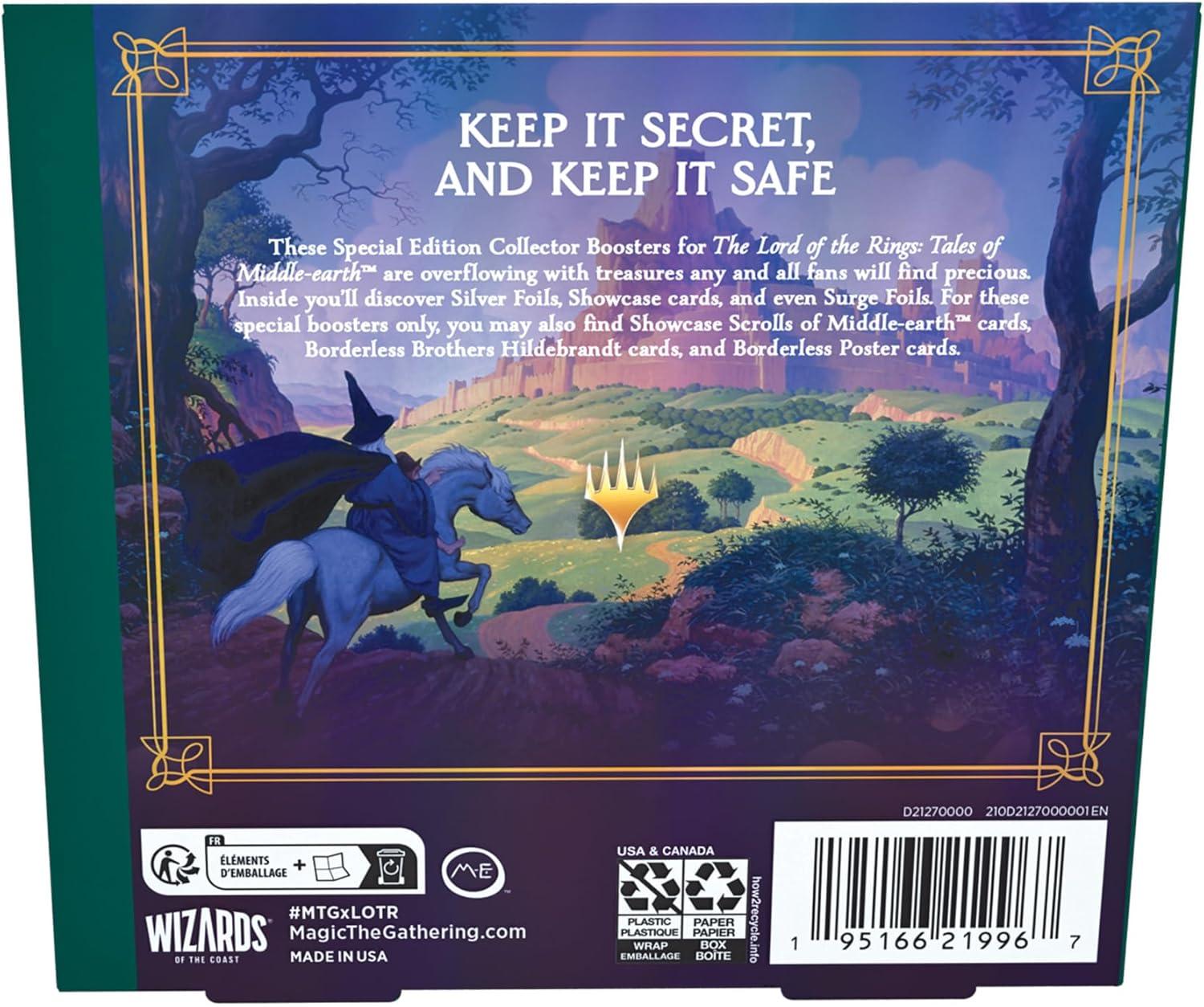 This The Lord of the Rings: Tales of Middle-earth Collector Booster Box contains 12 Special Edition Collector Boosters overflowing with treasures any and all fans will find precious. Inside each pack you’ll discover 5–6 Silver Foil cards, 10 Showcase Scrolls of Middle-earth cards, and even 2–3 Surge Foil cards. Each booster contains a total of 15 cards, including 5 cards of rarity Rare or higher and 5 Uncommon, 4 Common, and 1 Land cards. A Serialized card (Borderless Poster or Borderless Realms & Relics) can be found in <1% of boosters. Special Edition Collector Boosters do not contain Serialized Ring cards, including the Serialized Elven, Dwarven, or Human Sol Ring cards, and the 1 of 1 Ring (Serialized 001 of 001). Serialized Elven, Dwarven, and Human Sol Ring cards can only be found in some Main Set (not Special Edition) The Lord of the Rings: Tales of Middle-earth Collector Boosters. The Serialized 1 of 1 Ring was originally in a Main Set English Collector Booster but was found on June 30, 2023. Non-serialized cards are mechanically identical to their Serialized versions.