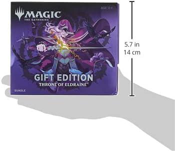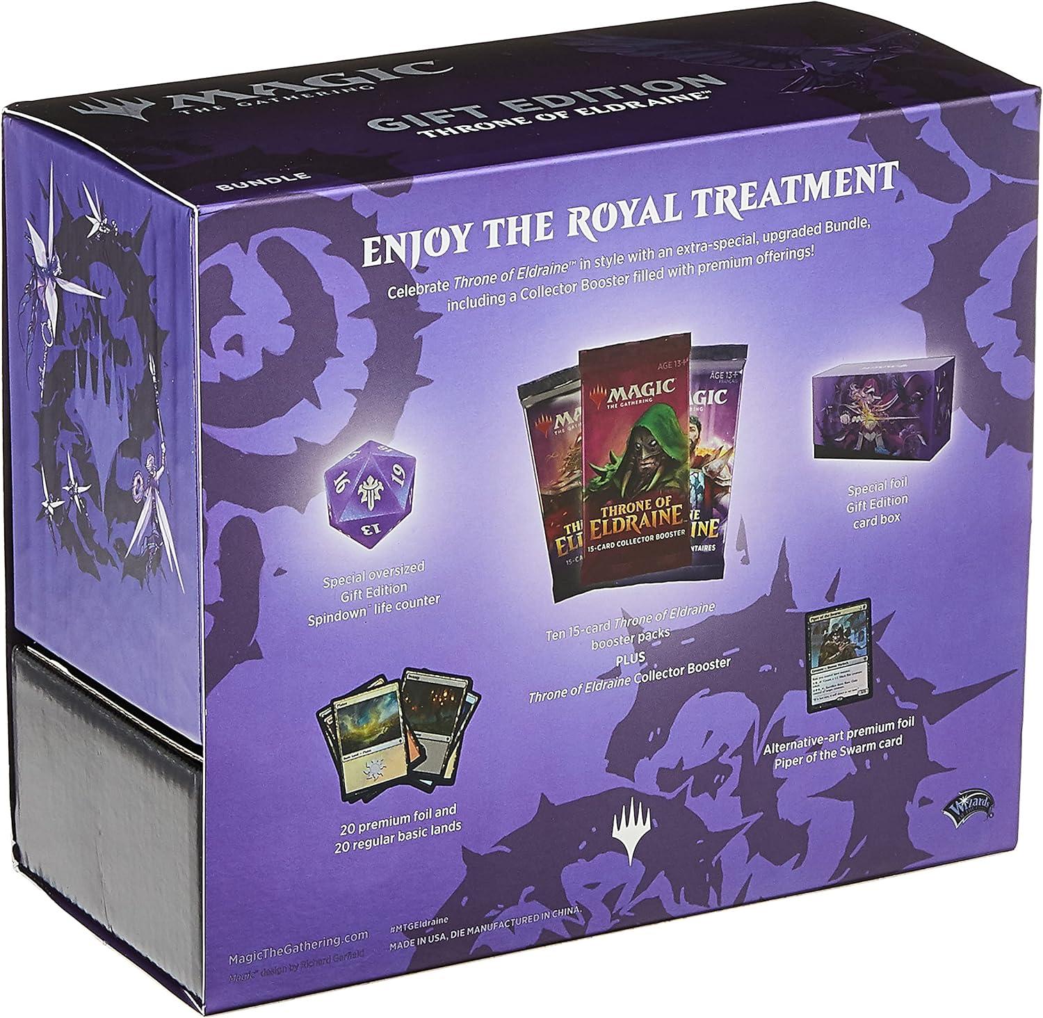 Bundle Gift Edition is a turbocharged Throne of Eldraine (ELD) Bundle, with all the usual Bundle treasures, plus 1 Collector Booster, and an oversized Spindown life counter not found anywhere else, all inside an alternate-art storage box.