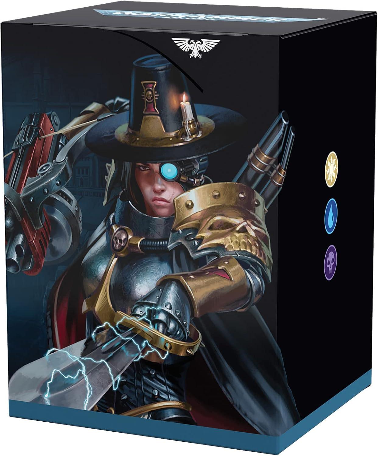 The Forces of the Imperium Universes Beyond: Warhammer 40,000 Commander Deck set includes 1 ready-to-play White-Blue-Black deck of 100 Magic: The Gathering cards (2 legendary traditional foil cards, 98 nonfoil cards), 1 foil-etched Display Commander (a thick cardstock copy of the commander card with foil etched into the card’s border and art), 10 double-sided tokens, 1 deck box (can hold 100 sleeved cards), 1 life tracker, 1 strategy insert, and 1 reference card.